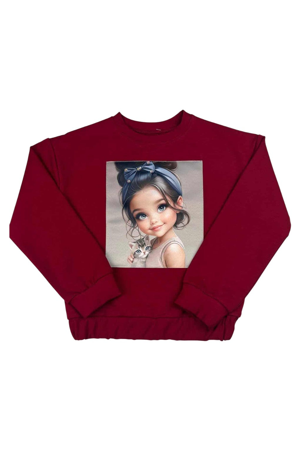 Mädchen-Sweatshirt in Burgunderrot mit Katzenmotiv