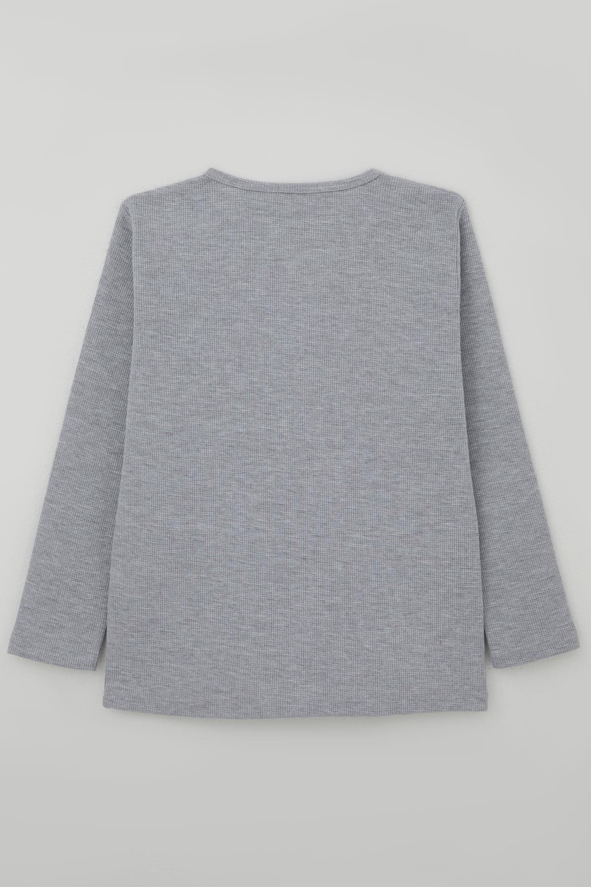 Przód bluzy zdobi zapięcie na guziki, które dodaje jej klasycznego charakteru i ułatwia zakładanie oraz zdejmowanie. Długie rękawy zapewniają dodatkową ochronę przed chłodem, a prosty krój sprawia, że bluza jest wygodna i nie krępuje ruchów dziecka. Tył bluzy jest gładki, co podkreśla jej minimalistyczny styl.