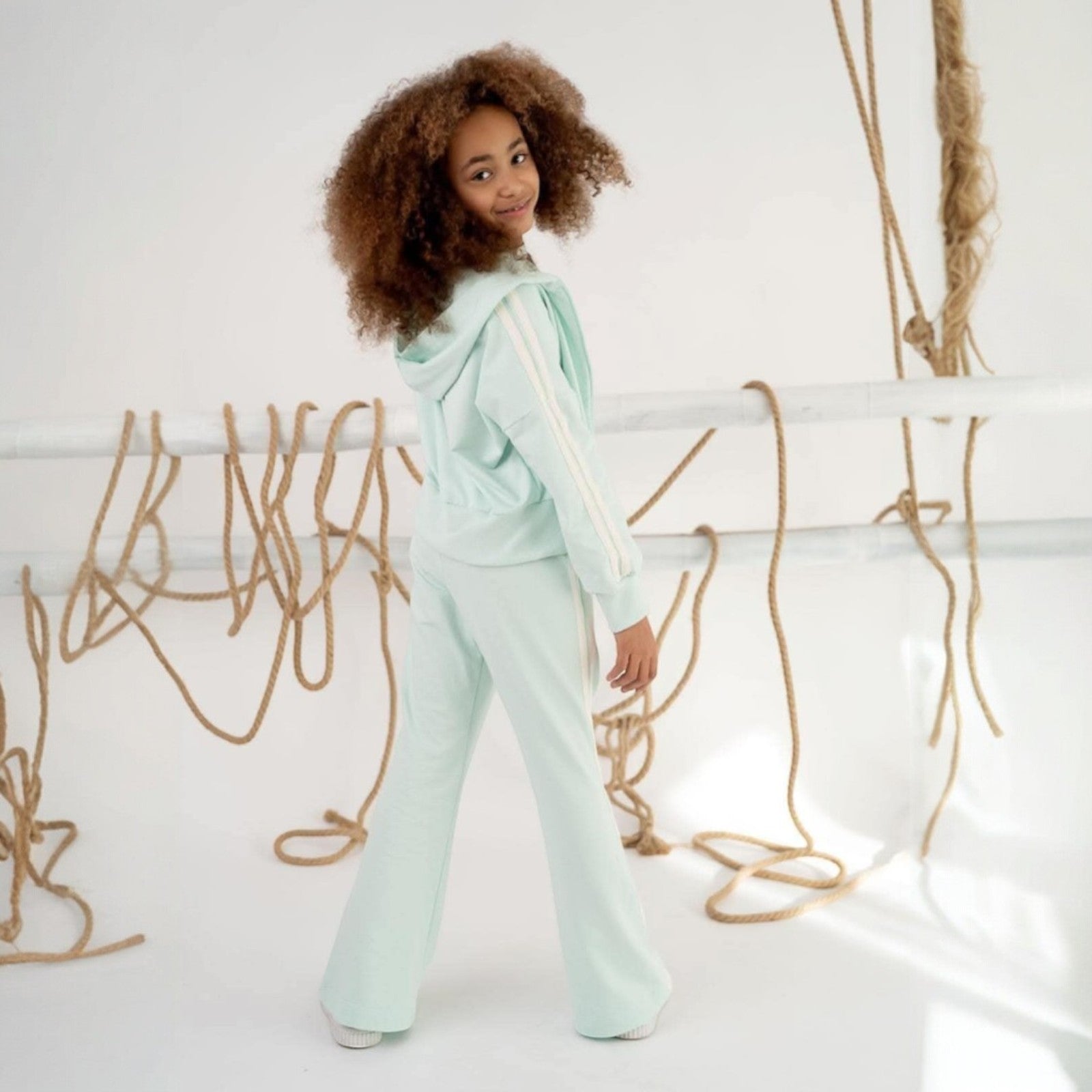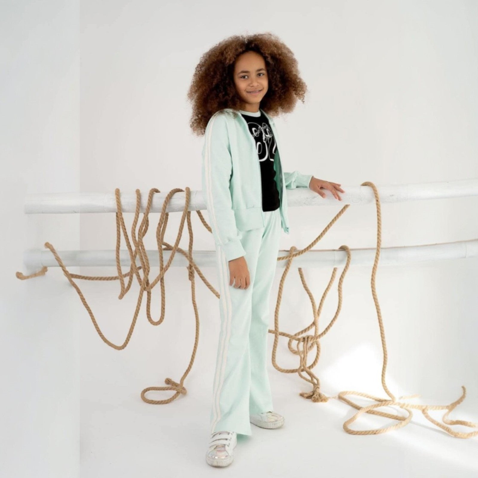 Mädchen-Sweatshirt mit Streifen in pastellfarbenem Mint. Hergestellt aus weichem Sweatshirtstoff bietet es Komfort und Leichtigkeit. Eine klassische Kapuze , ein durchgehender Reißverschluss sowie elastische Bündchen und Saum sorgen für Komfort. Streifen entlang der Ärmel verleihen einen sportlichen Touch. Der Verzicht auf Taschen unterstreicht den minimalistischen Stil.