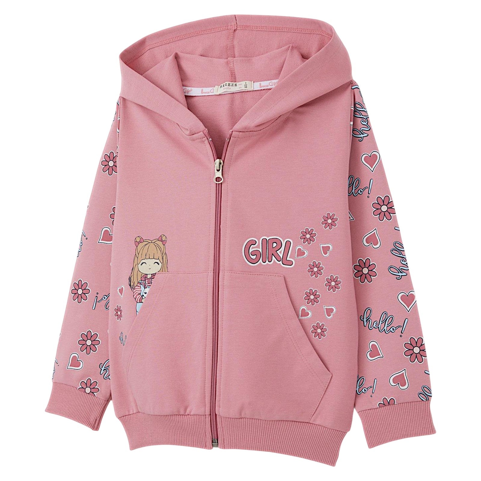 Modisch und bequem Kapuzenpullover für Mädchen Breeze ist die perfekte Wahl für kleine Liebhaber von Komfort und Stil. Hergestellt aus hochwertige Baumwolle Durch den Zusatz von Elasthan ist es weich und angenehm auf der Haut und gleichzeitig elastisch und strapazierfähig. Dunkelrosa Farbe kombiniert mit charmanten Drucke von Herzen, Blumen und Mädchen verleiht ihm einen mädchenhaften Charme.