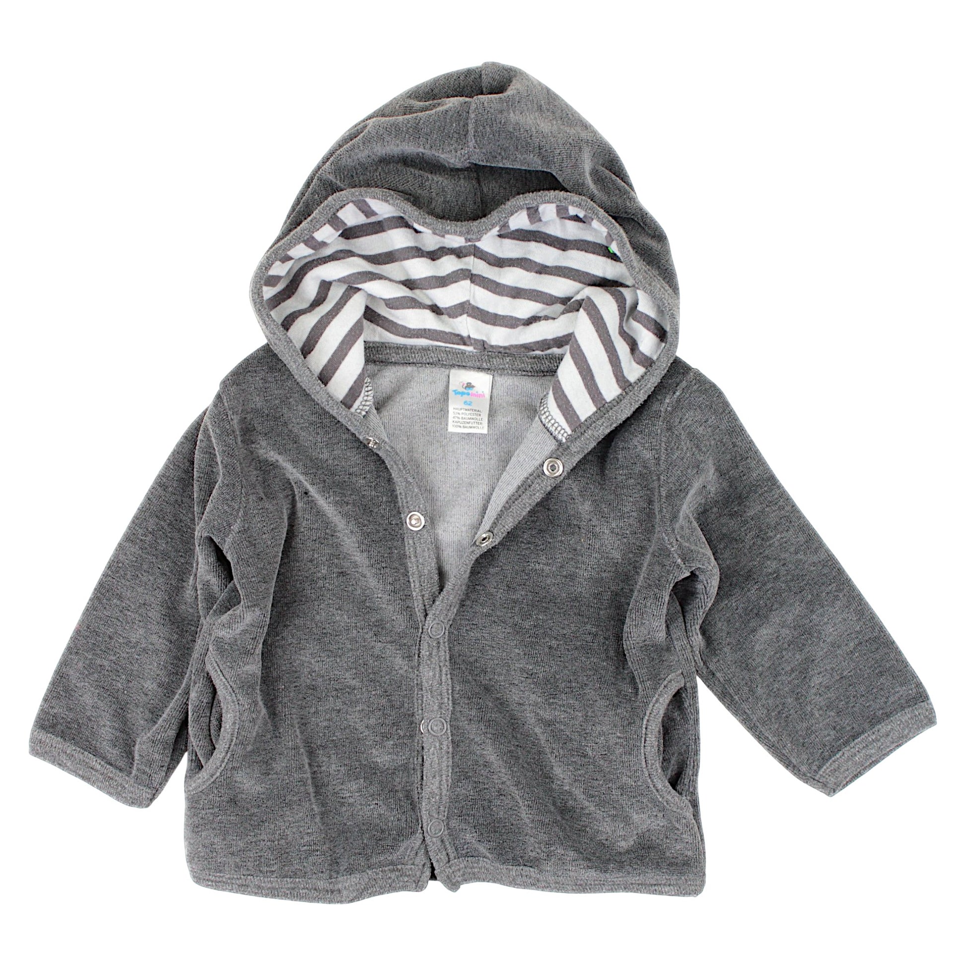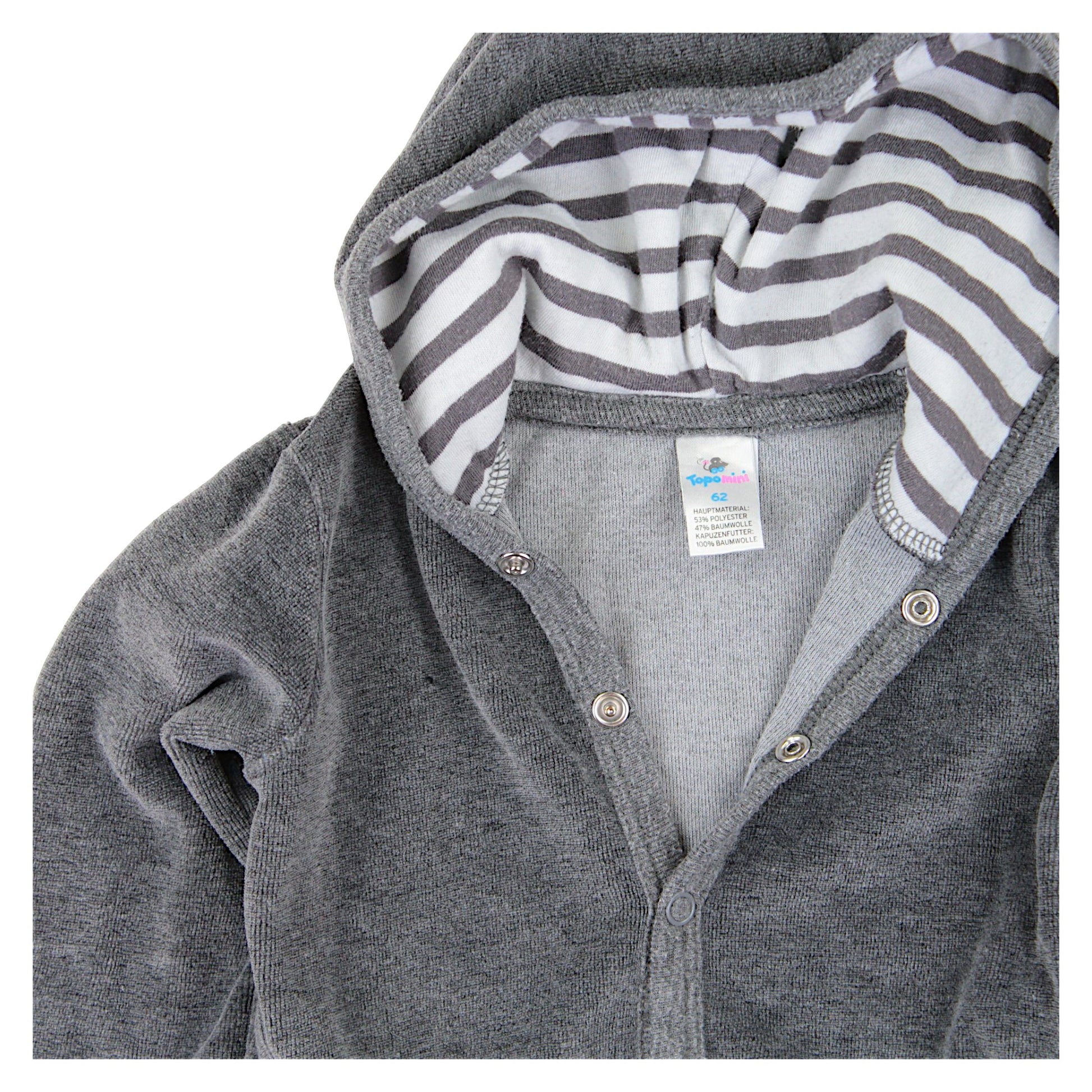 Dieser stylische graue Hoodie von Topomini ist die perfekte Wahl für die Frühlings- und Sommersaison. Hergestellt aus weichem, angenehm anzufassendem Material bietet er ganztägigen Komfort. Das Sweatshirt wird mit Druckknöpfen befestigt , was das An- und Ausziehen erleichtert und es unglaublich praktisch für kleine Kinder macht. Lange Ärmel und eine mit grauen Streifen gefütterte Kapuze verleihen Charme und Stil.