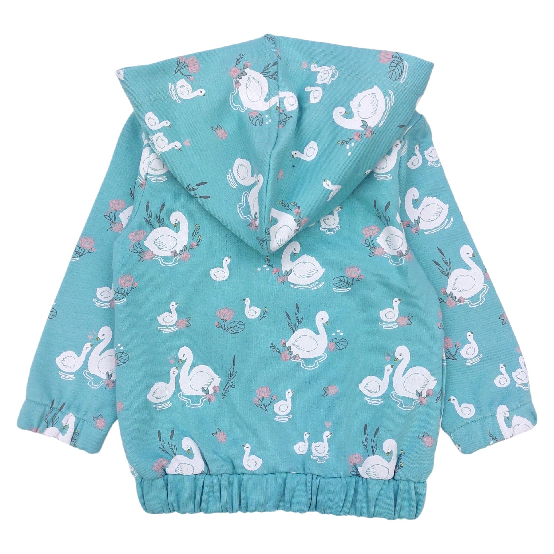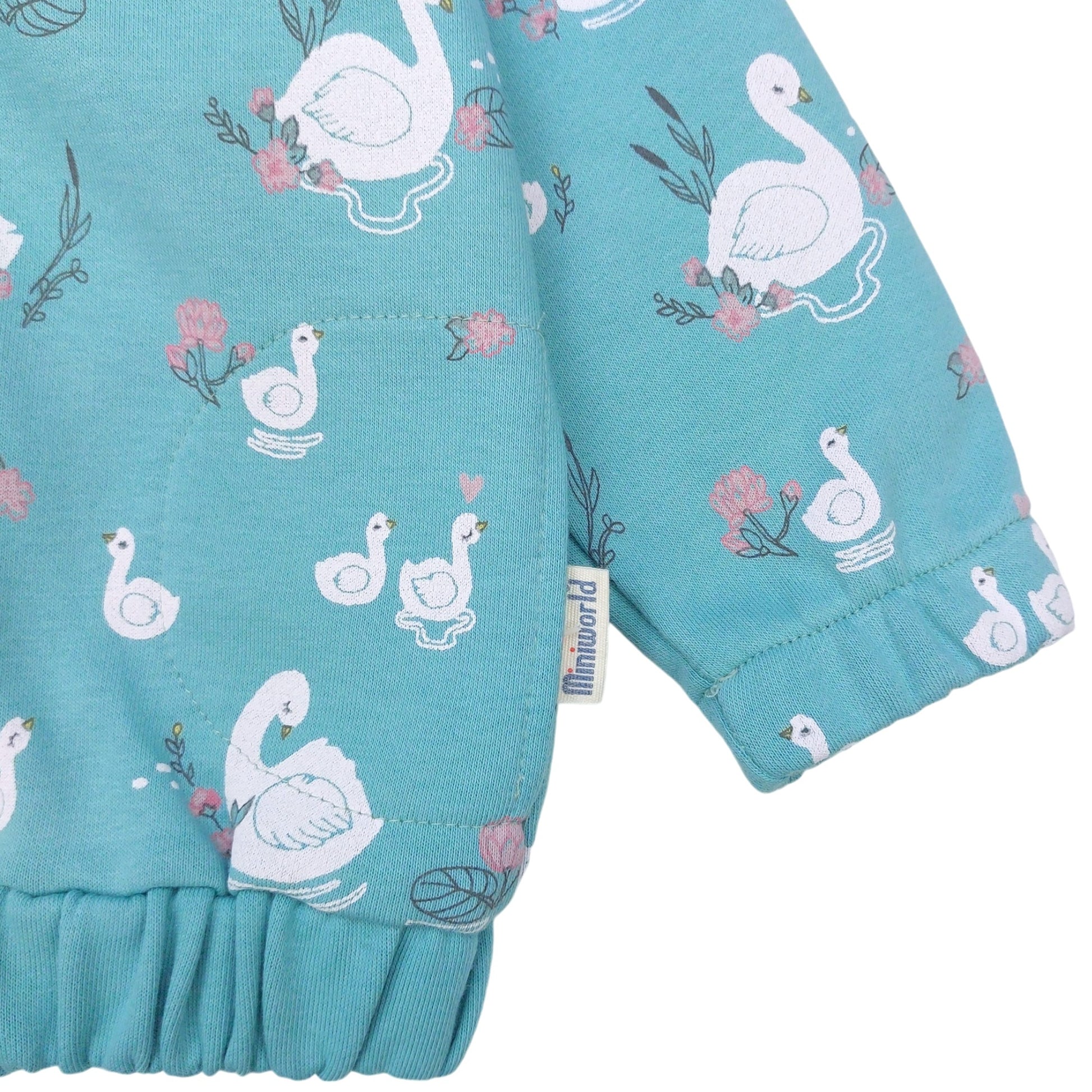 Dieser türkisfarbene Mädchen-Hoodie ist perfekt für die Herbst-/Wintersaison . Er ist aus weichem, bequemem Stoff gefertigt und mit einem bezaubernden Gänsemuster verziert. Er verfügt über einen Reißverschluss und elastische Bündchen und Saum für mehr Komfort. Zusätzlich verfügt der Hoodie über eine praktische Kapuze und zwei kleine, dezente Taschen auf der Vorderseite.