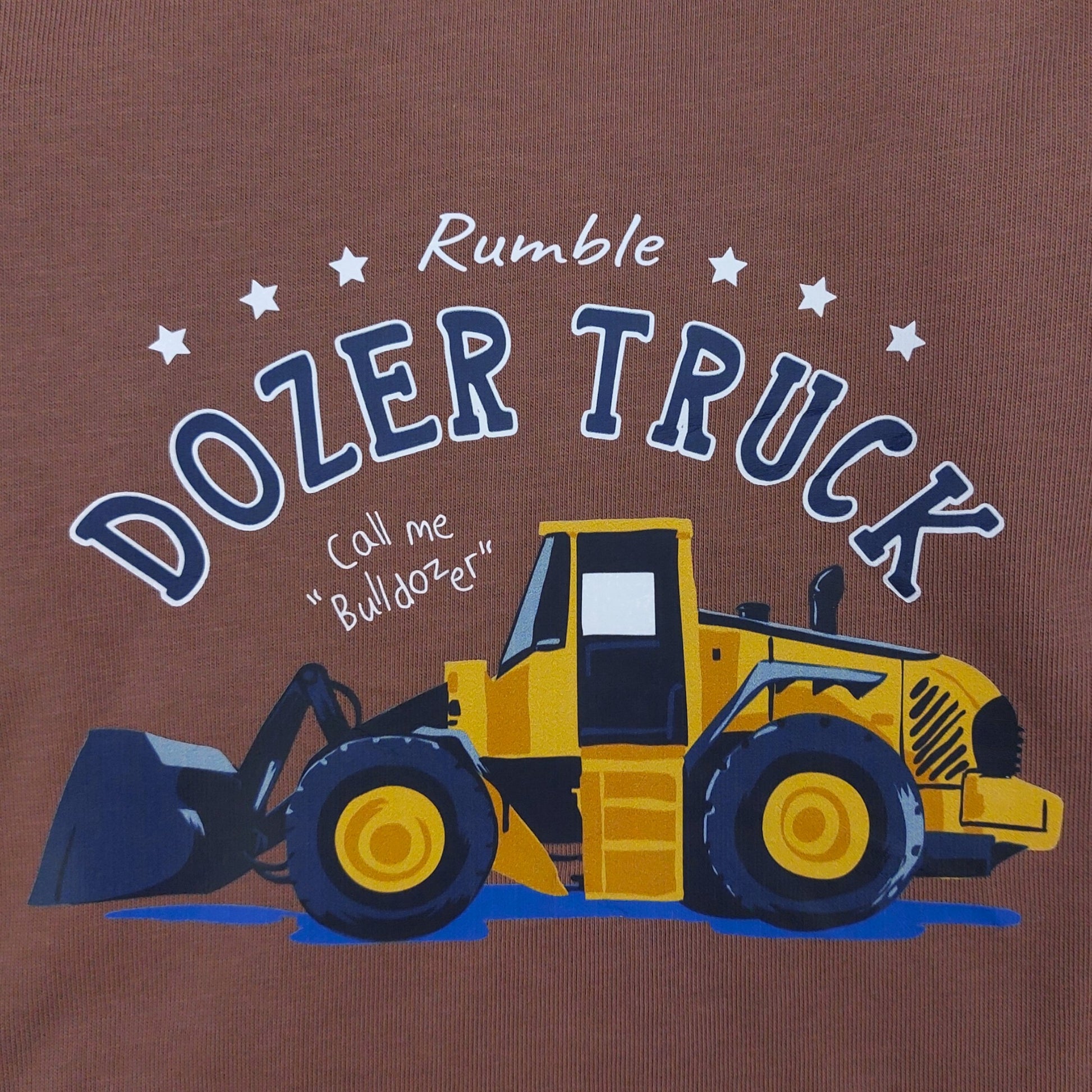 Dieses Baumwoll-T-Shirt für Jungen mit Baggermotiv „Dozer Truck“ von Your Word (Modell 864-30924) ist perfekt für kühlere Herbst- und Wintertage. Es ist in einem Braunton gehalten und trägt auf der Vorderseite einen großen, leuchtend gelben Baggeraufdruck sowie die Aufschrift „Rumble“ und „Call me Bulldozer“. Es hat lange Ärmel und gerippte Bündchen.