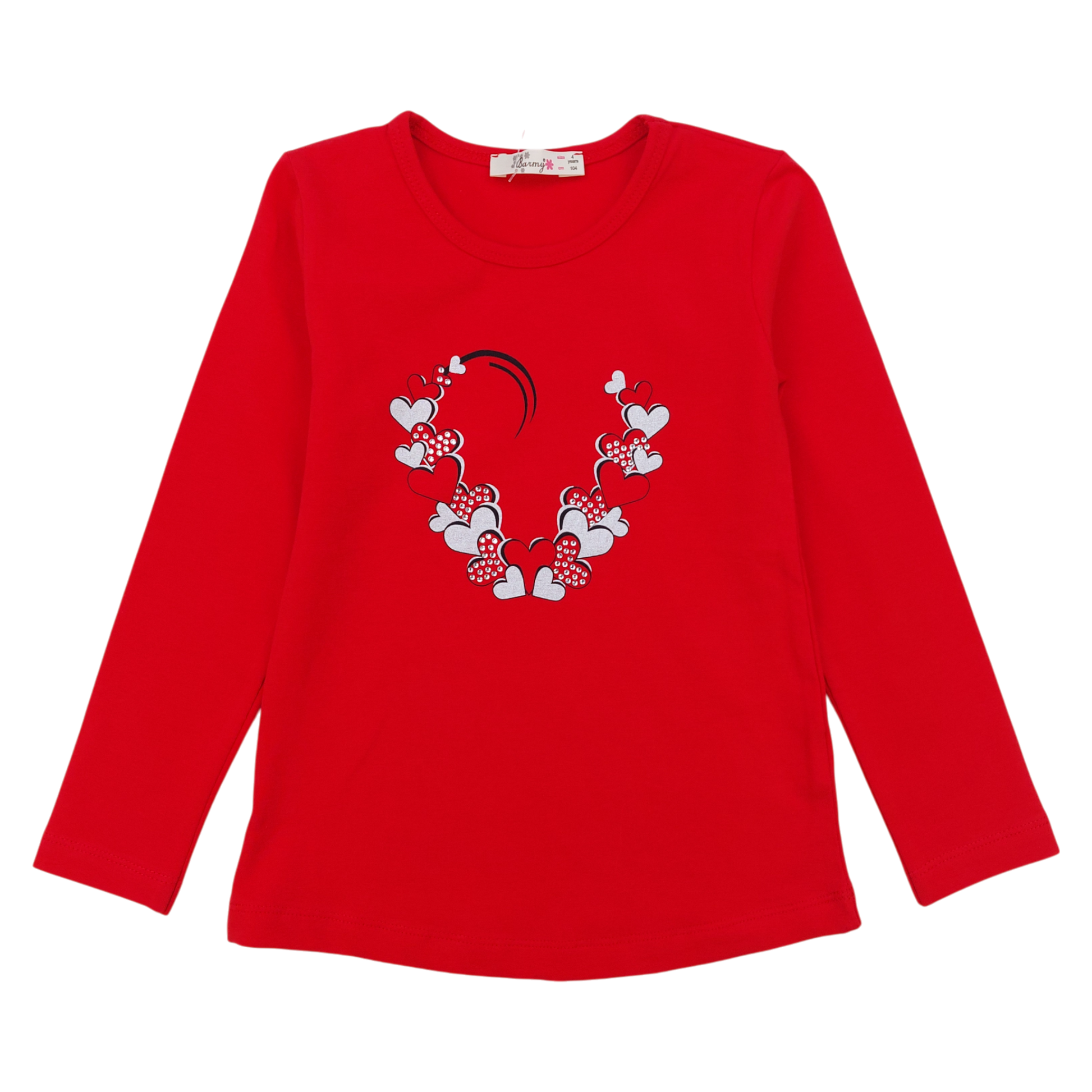 Eine stylische rote Langarmbluse für Mädchen mit dekorativem Herzmotiv und Strasssteinen. Aus weicher Baumwolle mit Elasthan-Anteil gefertigt, bietet sie Tragekomfort und Flexibilität. Perfekt für die Herbst- und Wintersaison.
