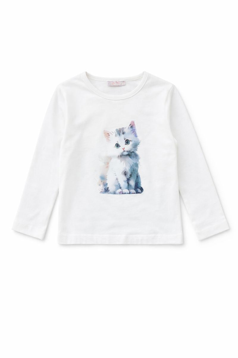 Na przodzie bluzki znajduje się uroczy nadruk z wizerunkiem kotka, który dodaje jej wyjątkowego uroku i sprawia, że jest idealna na każdą okazję. Długie rękawy skutecznie chronią przed chłodem, co czyni ją doskonałym wyborem na chłodniejsze dni. Bluzka nie posiada zapięć, co ułatwia jej zakładanie i zdejmowanie, a elastyczny materiał dopasowuje się do sylwetki dziecka, zapewniając wygodę noszenia przez cały dzień.