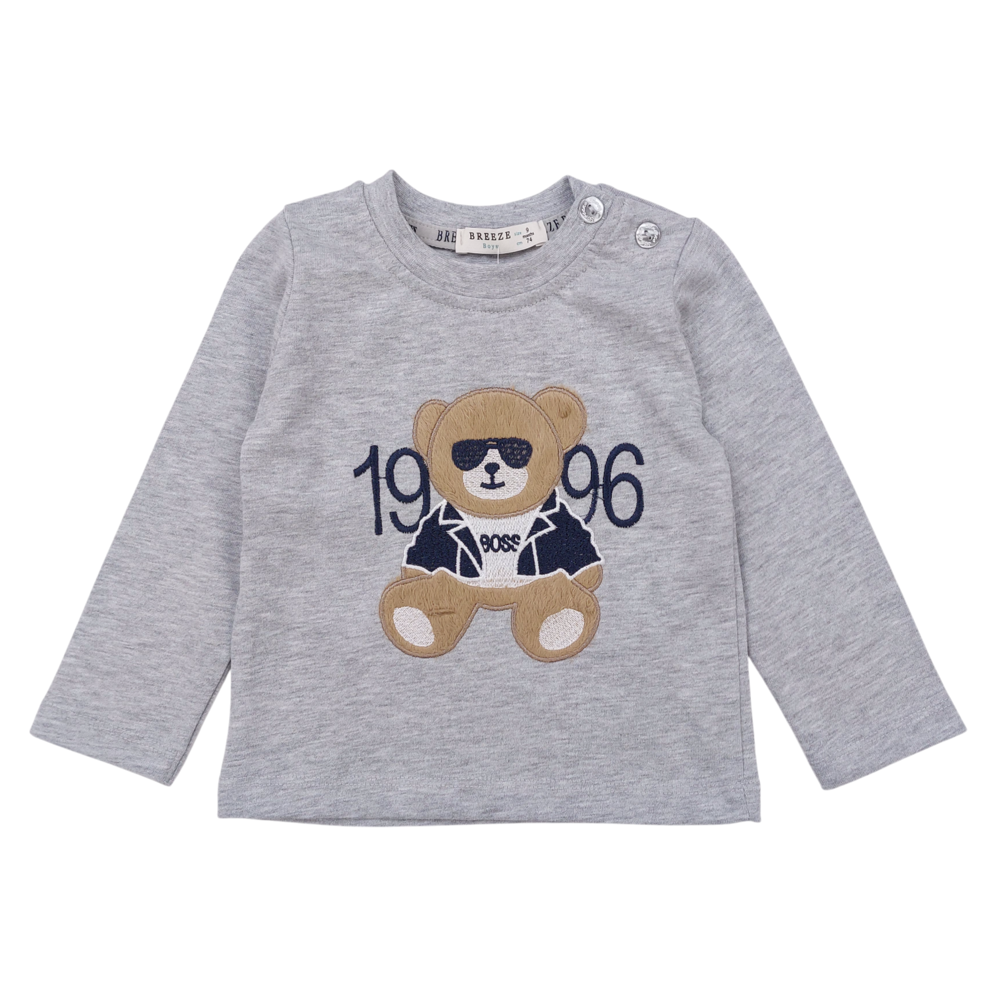 Diese bezaubernde graue Langarmbluse für Jungen zeigt einen Teddybären mit Brille und der Aufschrift „1996“. Sie verfügt über einen praktischen Schulterverschluss für einfaches An- und Ausziehen. Perfekt für die Frühlings- und Sommersaison.