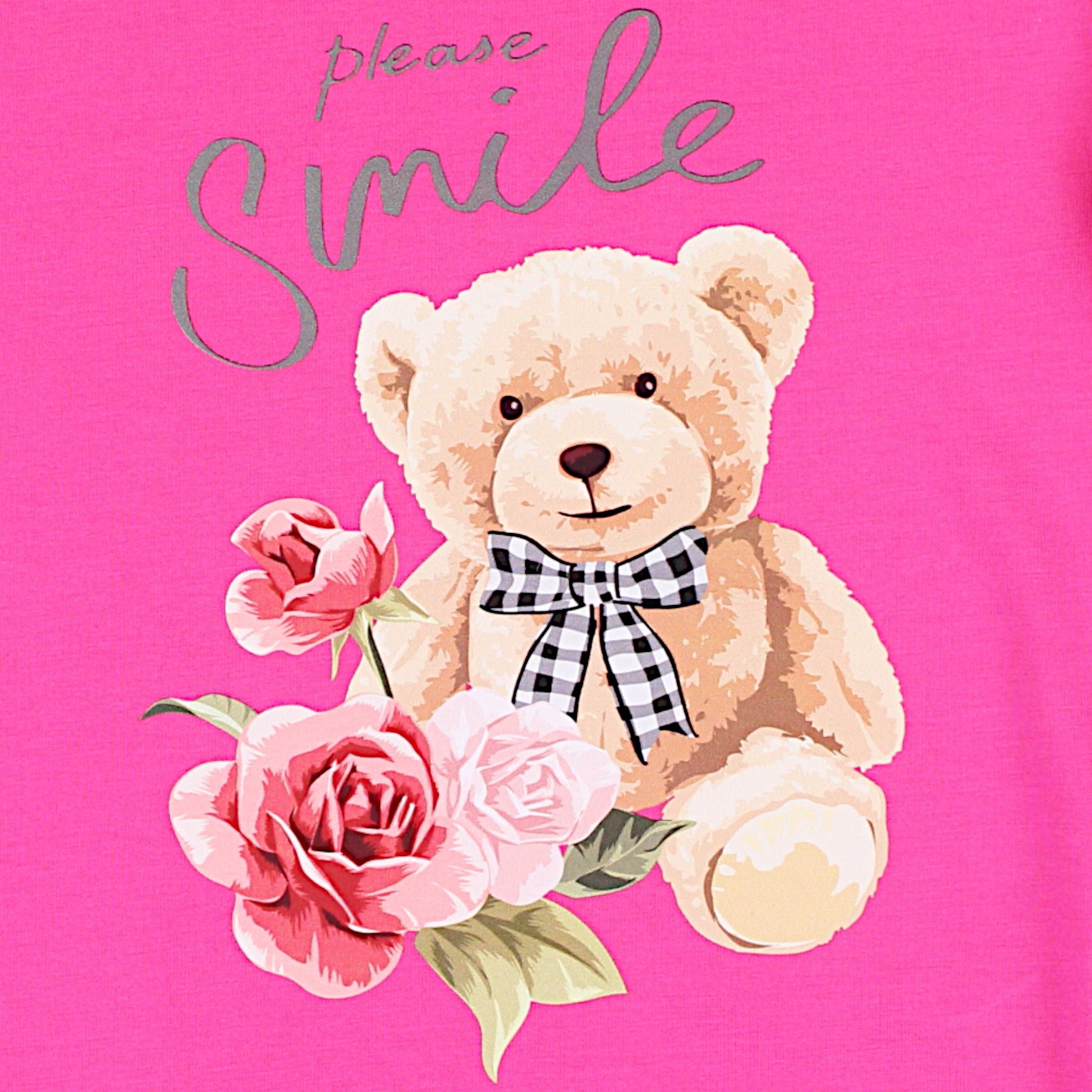 Eine kurzärmelige Mädchenbluse in intensivem Fuchsia-Ton. Aus weicher Baumwolle gefertigt, bietet sie hohen Tragekomfort für jeden Tag. Ein bezaubernder Teddybär -Print mit Schleife, umgeben von Blumen und dem Schriftzug „Please Smile “, ziert die Vorderseite und verleiht ihr einen Hauch von mädchenhaftem Charme. Der runde Ausschnitt erleichtert das Anziehen, und das dehnbare Material passt sich der Figur des Kindes an. Perfekt für den Sommer-Look, passt sie sowohl zu Hosen als auch zu Röcken .