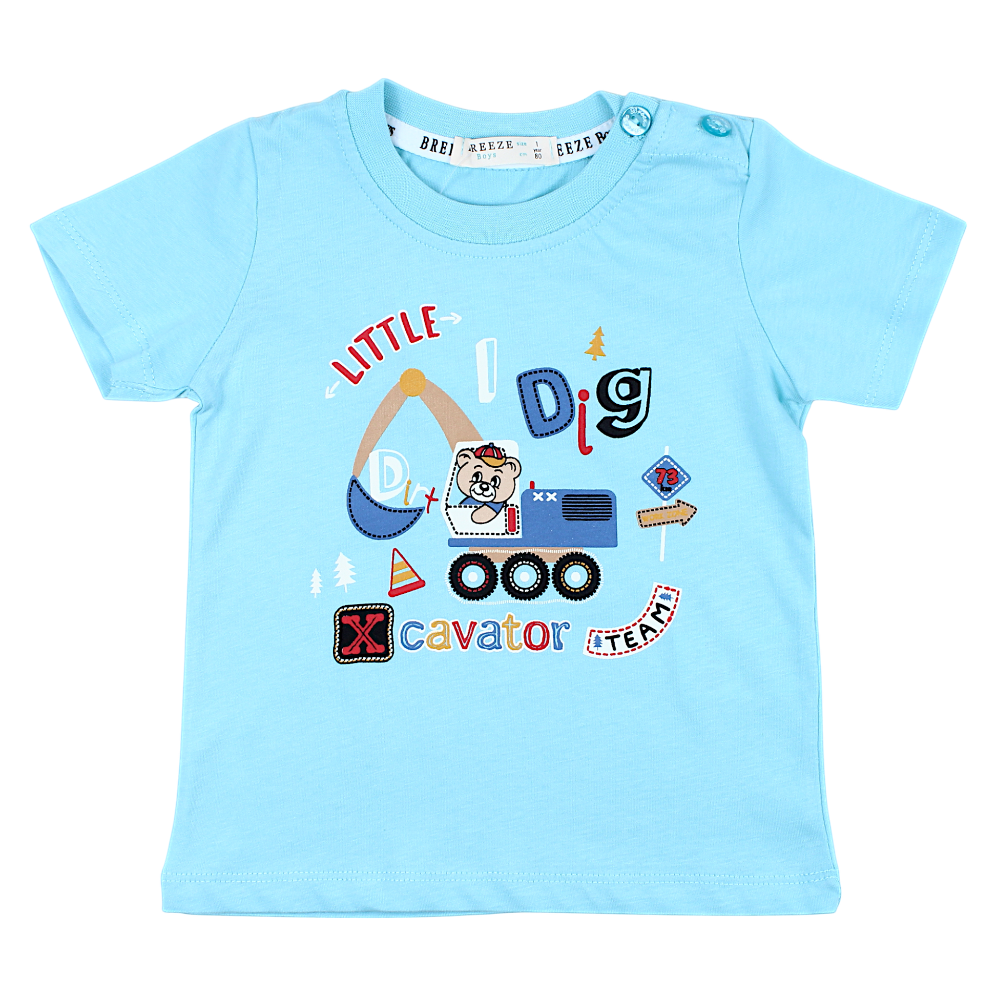 Wir präsentieren eine bezaubernd designte Jungenbluse von Breeze, perfekt für die Frühjahr-/Sommersaison. Diese auffällige Bluse ist in einem wunderschönen Türkiston gefertigt. Die Vorderseite ziert ein farbenfroher Aufdruck mit einem Bagger und einem fröhlichen Teddybären , der jedem kleinen Entdecker gefallen wird. Die Bluse hat kurze Ärmel und ist perfekt für warme Tage. Der bequeme Schnitt gewährleistet ein angenehmes Tragegefühl, während die hochwertige Baumwolle Atmungsaktivität und Weichheit gewährleistet. Ein praktischer Zwei-Knopf-Verschluss an der Schulter macht das An- und Ausziehen der Bluse einfach. Die Rückseite der Bluse ist einfarbig, was ihre universelle Anziehungskraft unterstreicht. Das für Kinder entworfene Design macht die Bluse sowohl praktisch als auch stilvoll. Sie ist die perfekte Wahl für jeden Jungen , der gerne spielt und entdeckt.