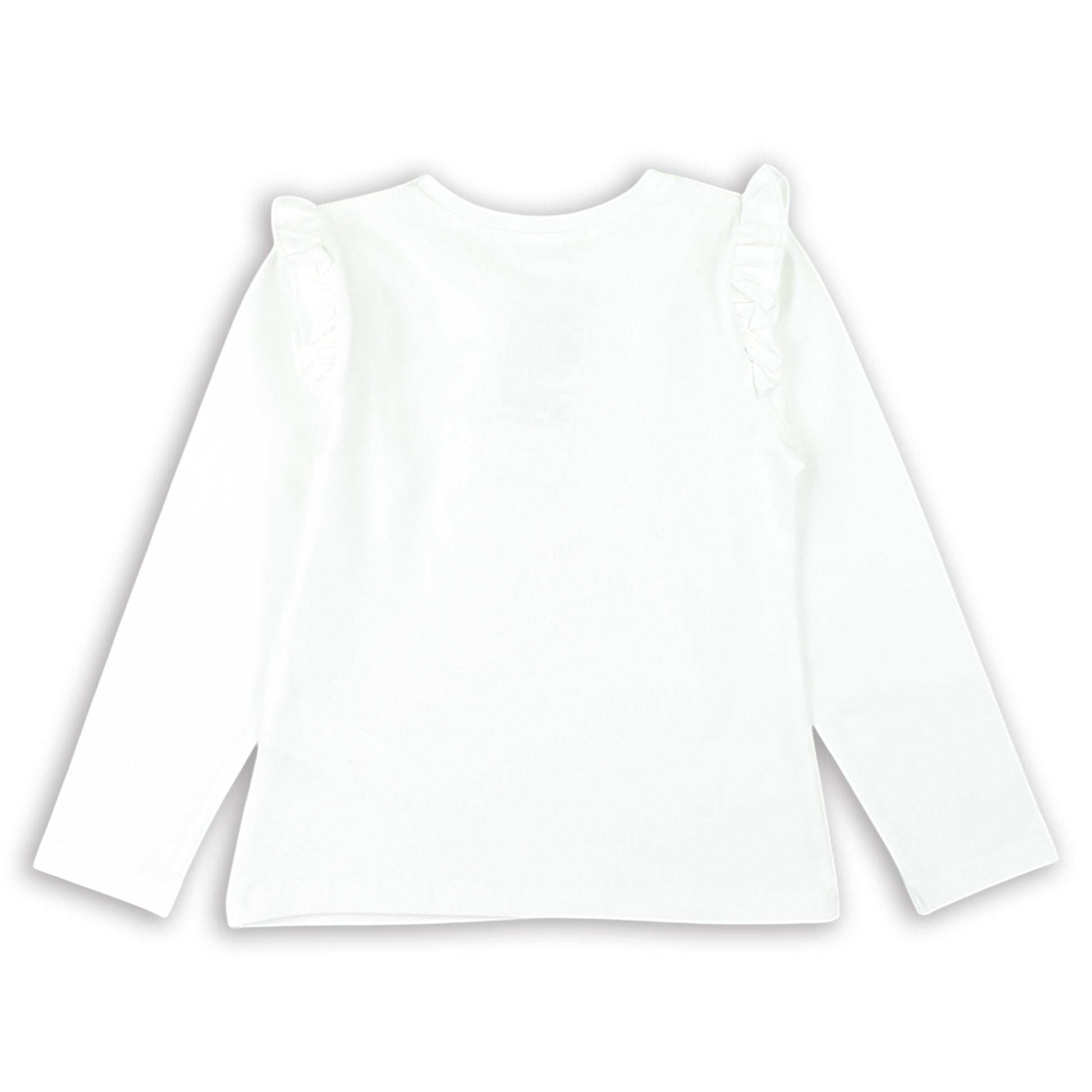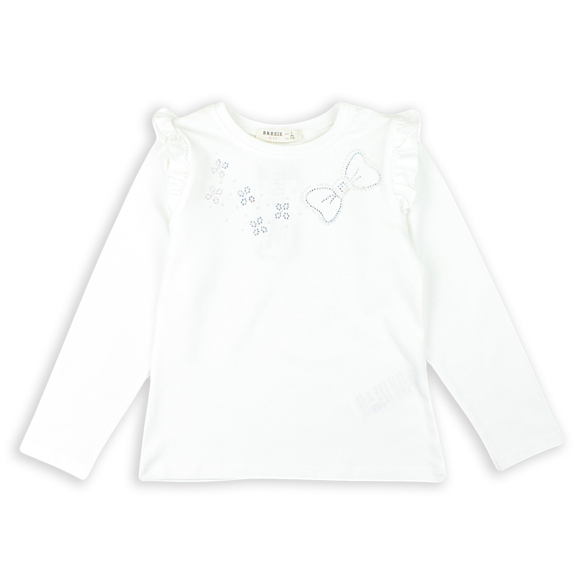 Diese elegante Langarmbluse für Mädchen ist aus weicher Baumwolle gefertigt. Zarte Rüschen an den Schultern verleihen ihr eine feminine Note. Die Vorderseite ist mit dezenten blütenförmigen Applikationen und einer Schleife mit schimmernden Strasssteinen verziert. Der klassische Schnitt sorgt für Tragekomfort, und das dehnbare Material passt sich der Figur an. Perfekt für den Alltag sowie elegante Anlässe.
