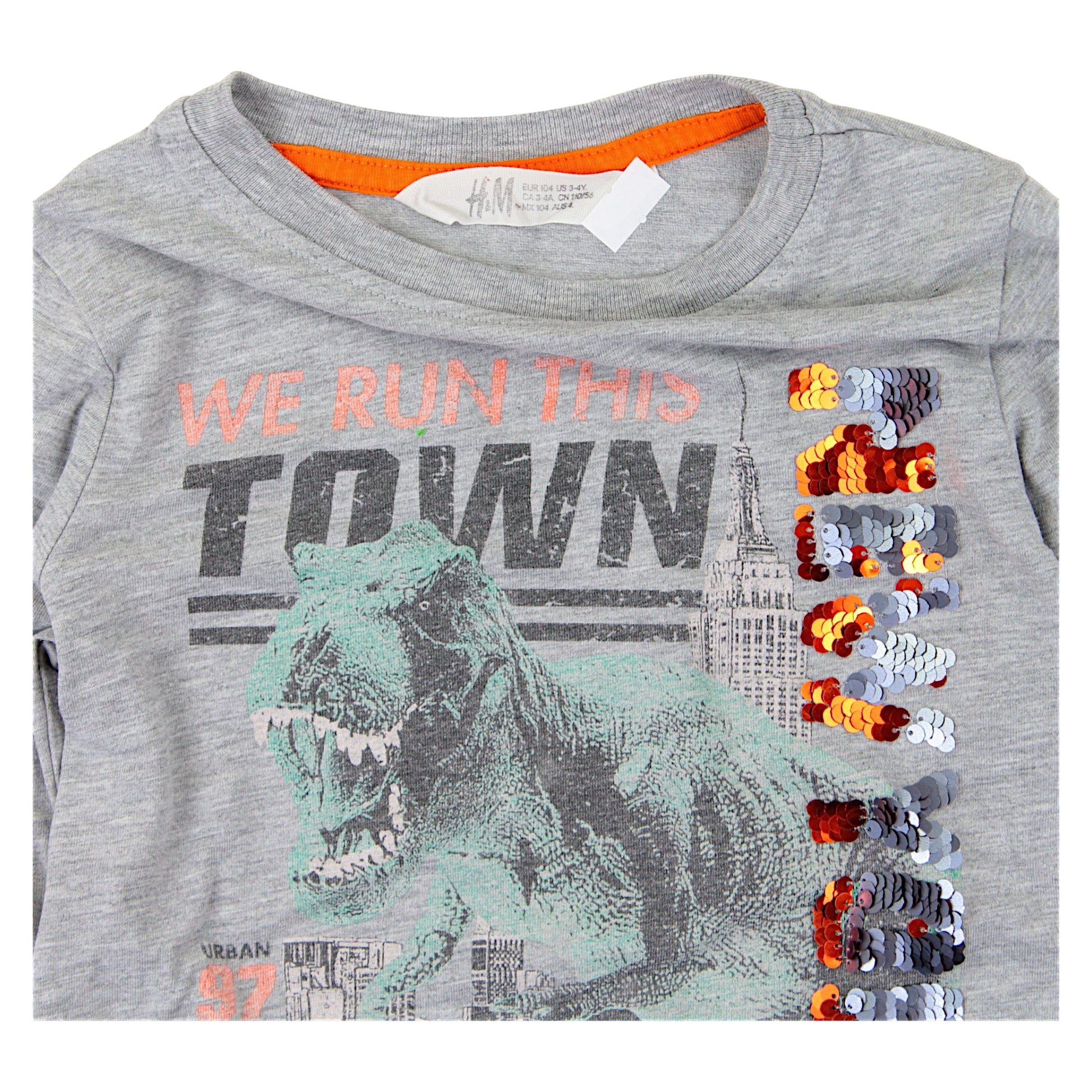 Langärmliges Jungen-T-Shirt von H&M mit Dinosaurier -Motiv. Die graue Farbe verleiht ihm einen vielseitigen Look, während der T-Rex-Aufdruck und der Pailletten-Schriftzug ihm einen modernen Look verleihen. Perfekt für den Alltag, egal ob für die Schule oder einen Spaziergang. Der bequeme Schnitt und das weiche Material sorgen für ganztägigen Tragekomfort.
