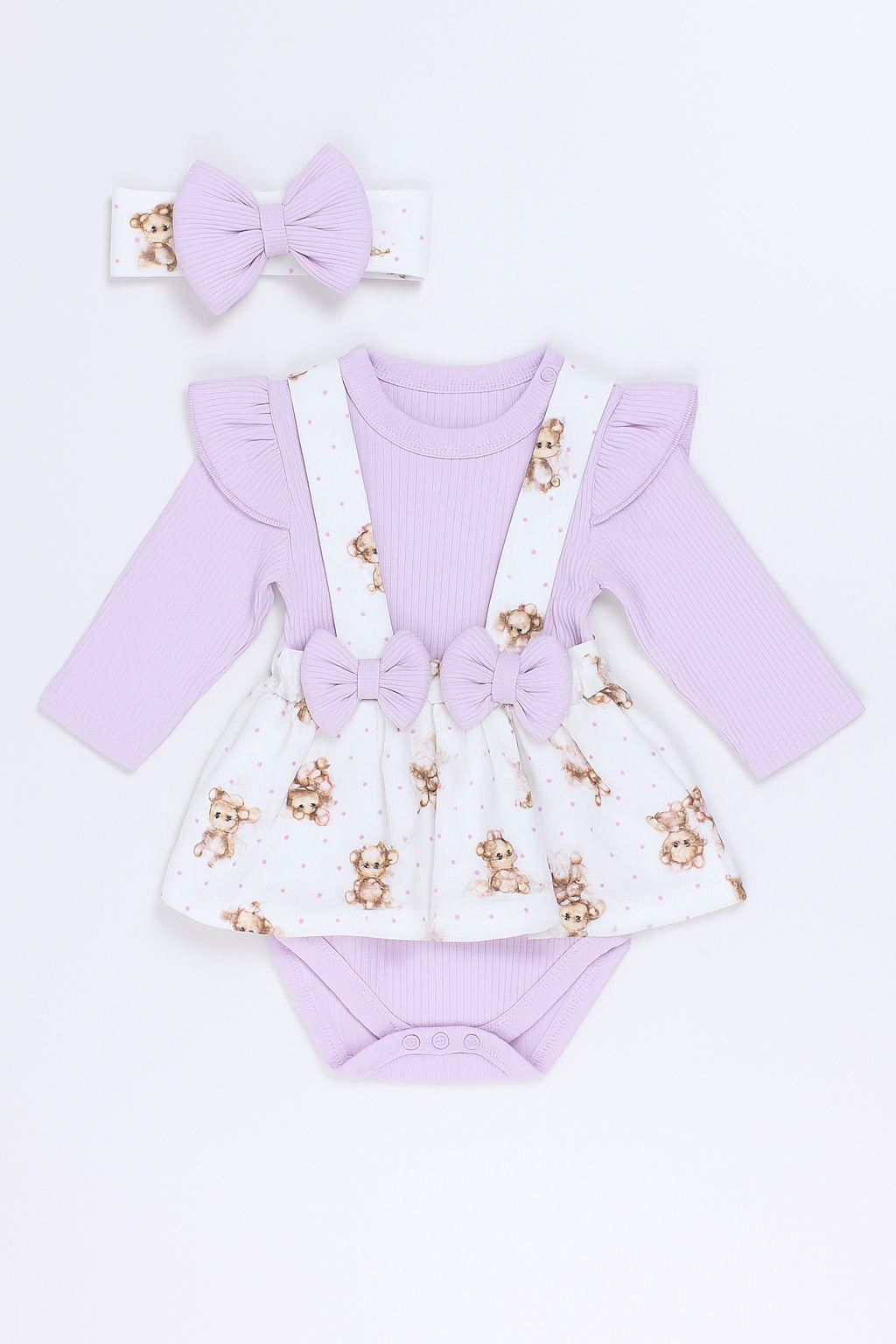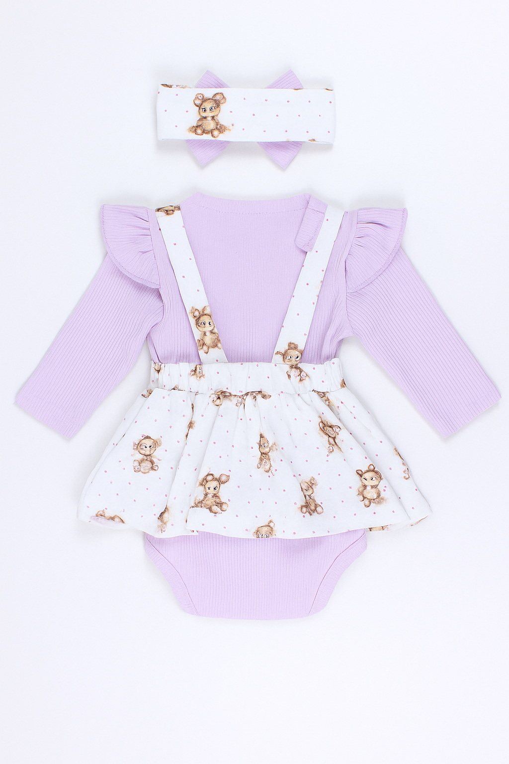 Dieses stilvolle lila Set für Mädchen wurde für alltäglichen Komfort und Eleganz entworfen. Das Set besteht aus drei Teilen: einem praktischen Body , einem bezaubernden Latzrock und einem stilvollen Stirnband . Jedes Teil vereint Funktionalität mit einzigartigem Stil und ist somit die perfekte Wahl für Ihre kleine Prinzessin.