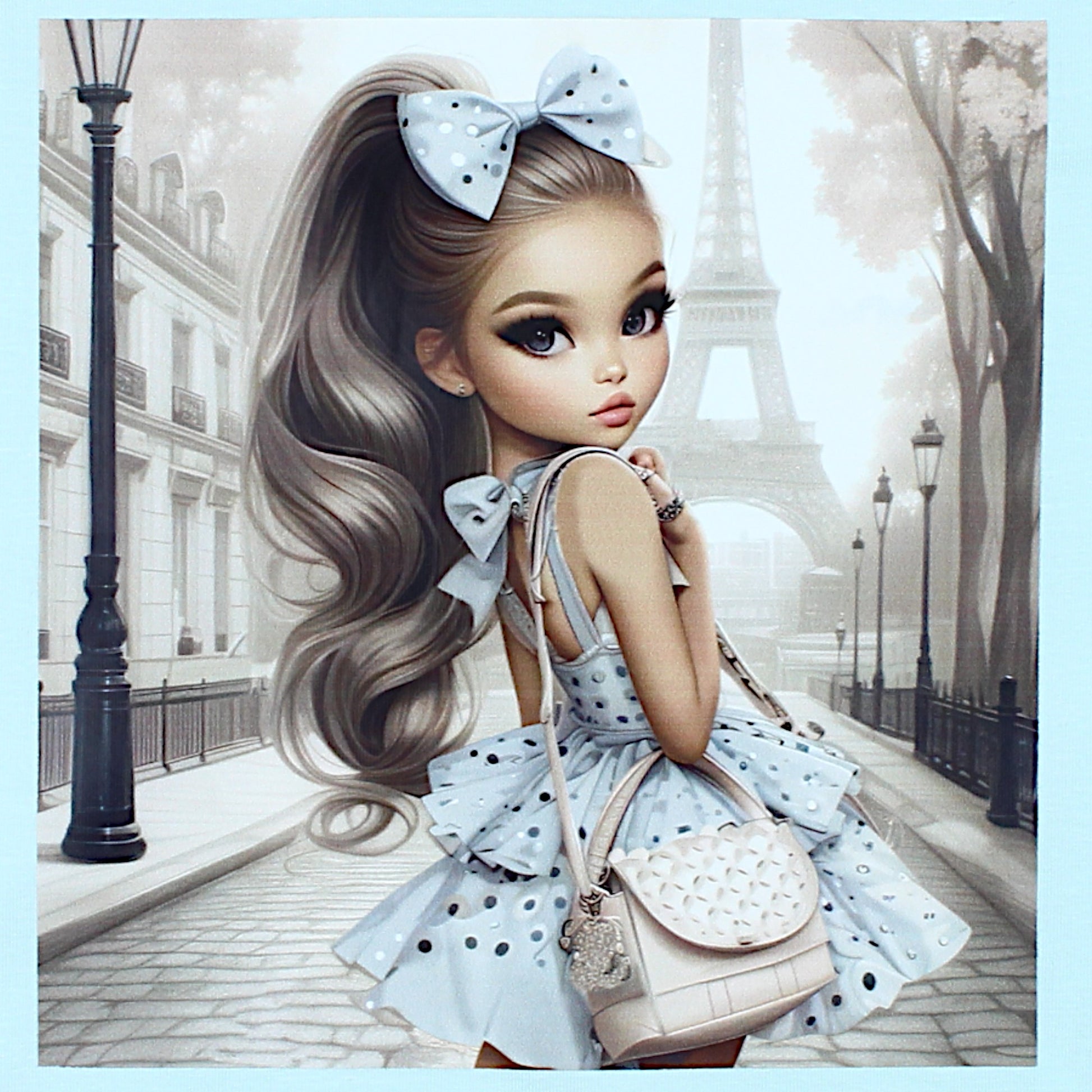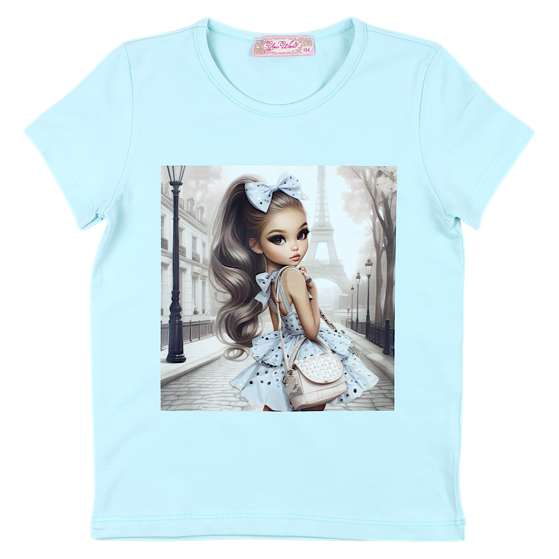 Diese mintfarbene Kurzarmbluse für Mädchen ist die perfekte Wahl für wärmere Tage. Die Vorderseite zeigt eine charmante Grafik, die ein Mädchen auf einer Pariser Straße mit dem Eiffelturm im Hintergrund zeigt. Ein auffälliger Print in der Mitte verleiht dem Oberteil eine einzigartige Note. Die Kanten sind für lange Haltbarkeit fein vernäht. Das weiche und dehnbare Material sorgt für Tragekomfort im Alltag. Perfekt für Frühling und Sommer.