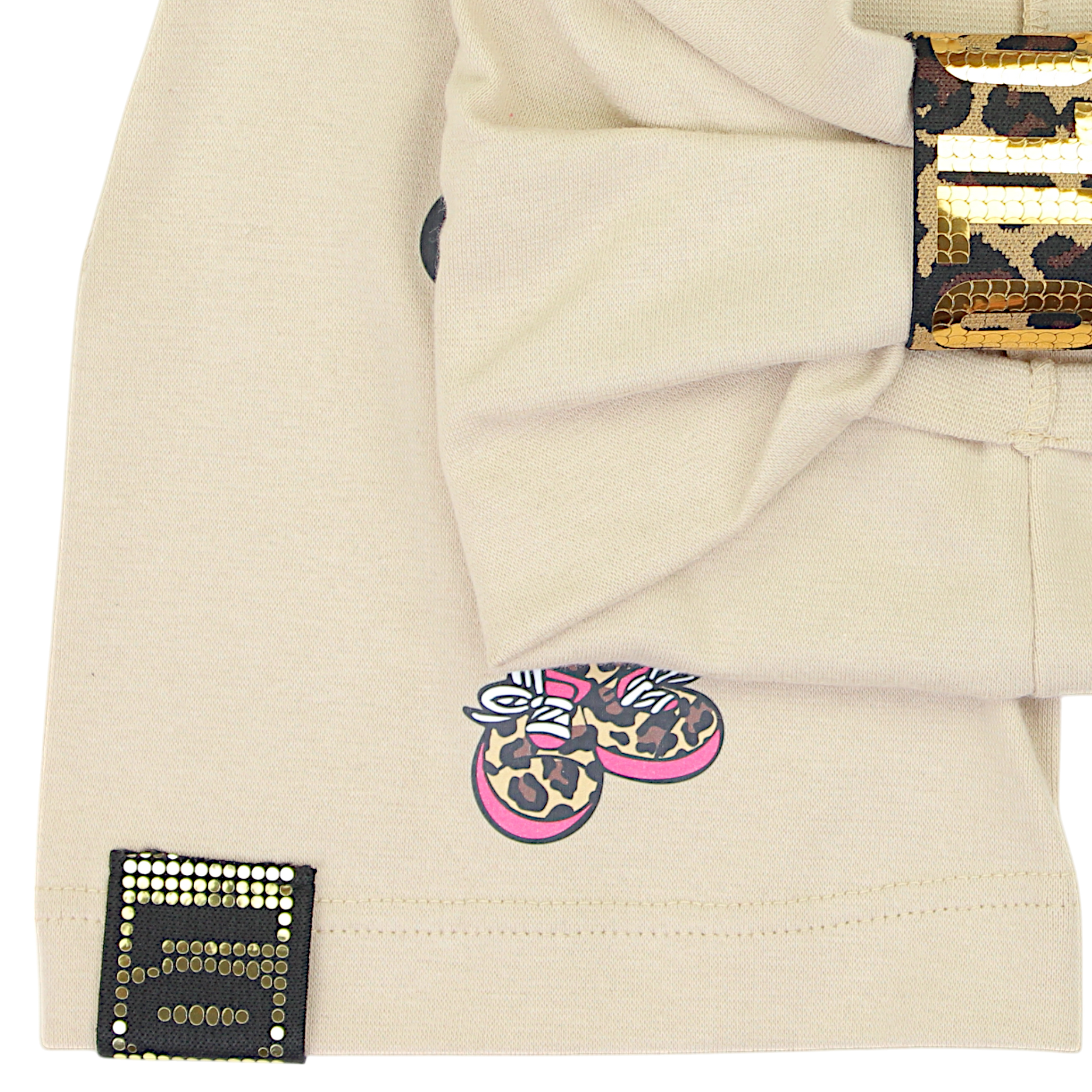 Ein modisches Mädchen-Set bestehend aus Mütze und Stirnband , perfekt für wärmere Tage. Das beige Set besticht durch eine bezaubernde Schleife und einen dekorativen Gürtel im Leopardenmuster mit funkelnden Details. Weicher und dehnbarer Stoff sorgt für Tragekomfort, während dezente Verzierungen , darunter stylische Pailletten und ein Sneaker-Print , einen mädchenhaften Touch verleihen. Der klassische Schnitt macht das Set zu einer vielseitigen Ergänzung für jedes Outfit.