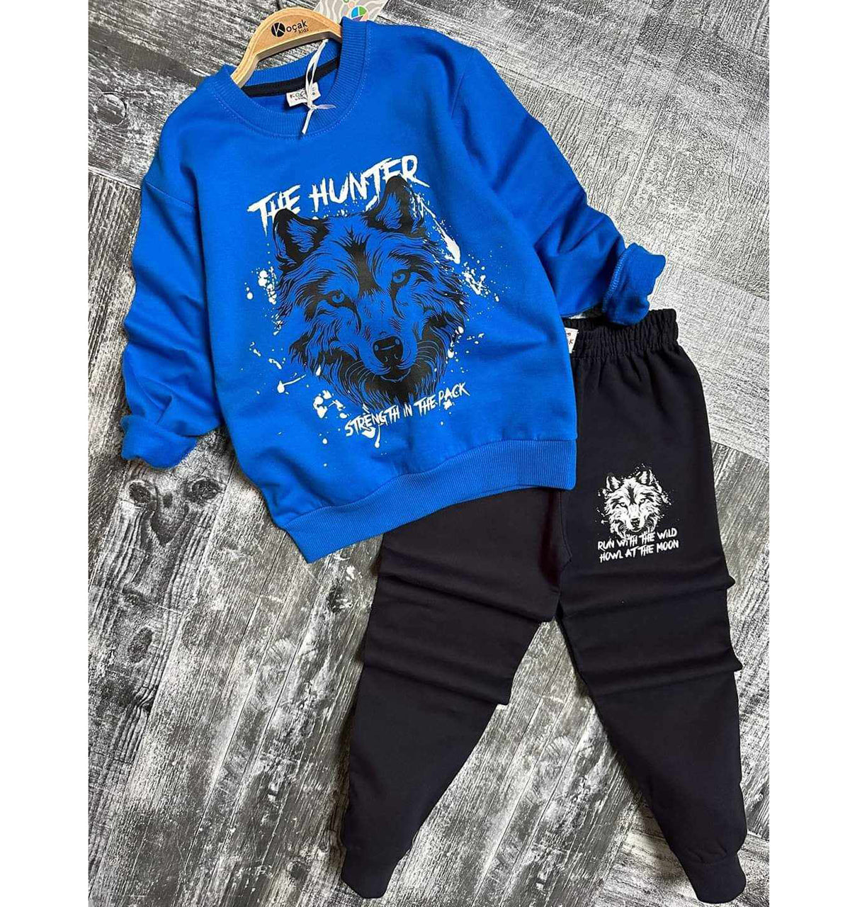 Modischer Trainingsanzug für Jungen mit Wolfsmotiv in leuchtendem Saphirblau. Das Set besteht aus einem warmen Sweatshirt mit Wolfsprint und einer bequemen Jogginghose mit Taschen. Perfekt für kühlere Tage im Herbst und Winter.