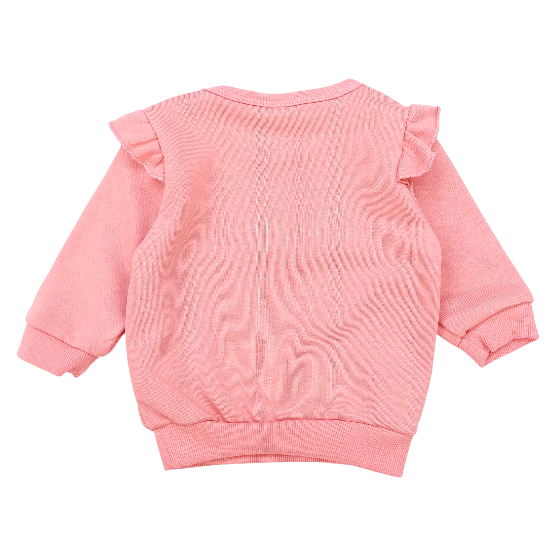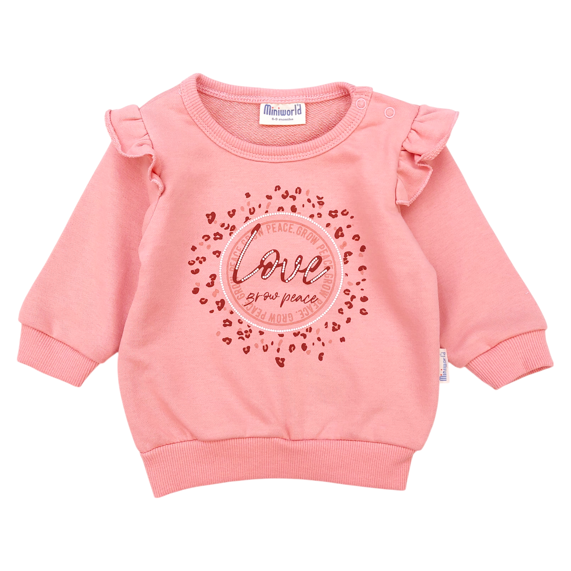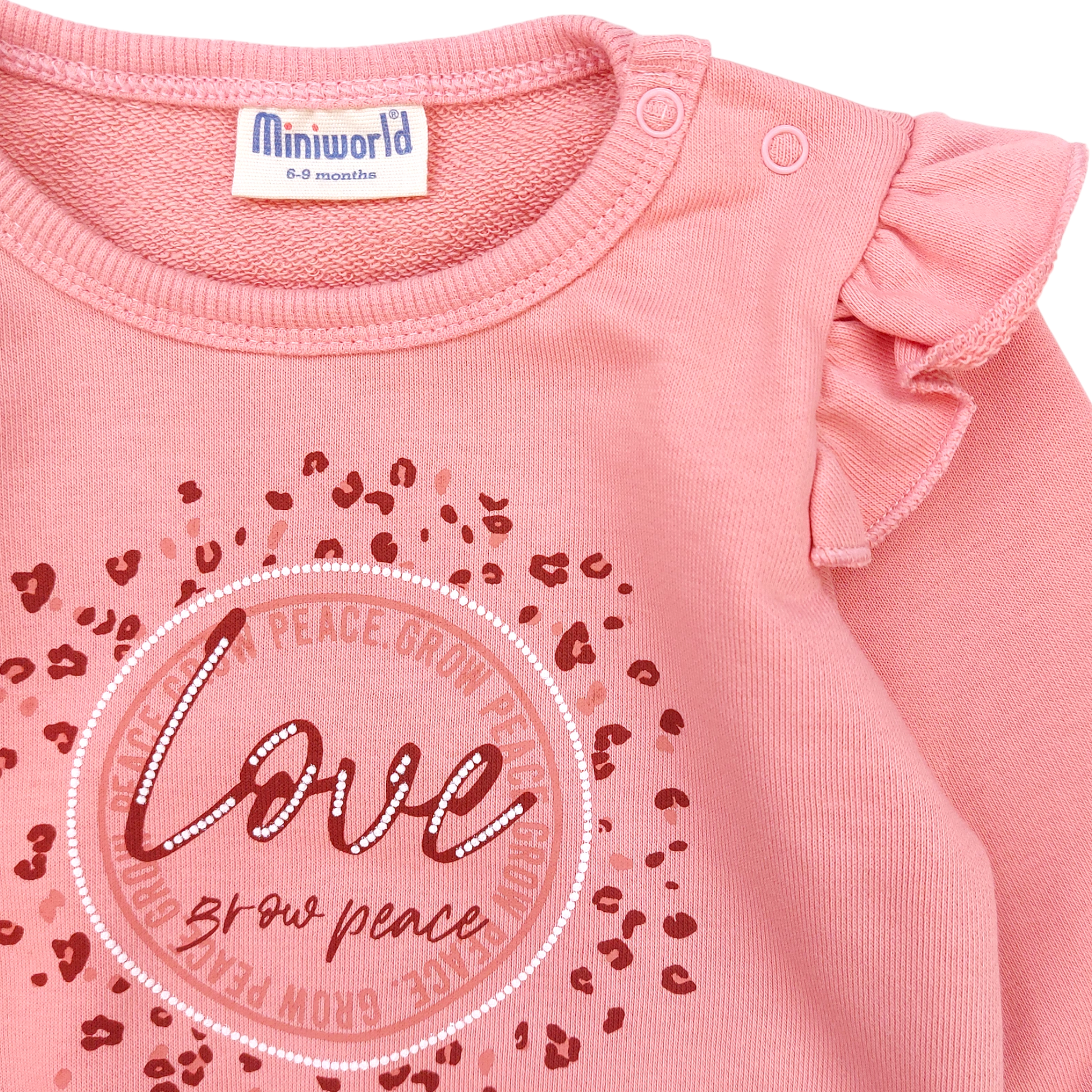 Niedlich Mini World Mädchen-Trainingsanzug Eine Kombination aus Komfort und Stil, entworfen für kleine Modeliebhaber. Dieses zarte fangofarbene Sweatshirt hat einen wunderschönen „Love Grow Peace“-Print mit Glitzer-Finish und dezenten Rüschen an den Schultern, die ihm einen mädchenhaften Touch verleihen. Der Schulterverschluss erleichtert das Anziehen und sorgt für Tragekomfort.