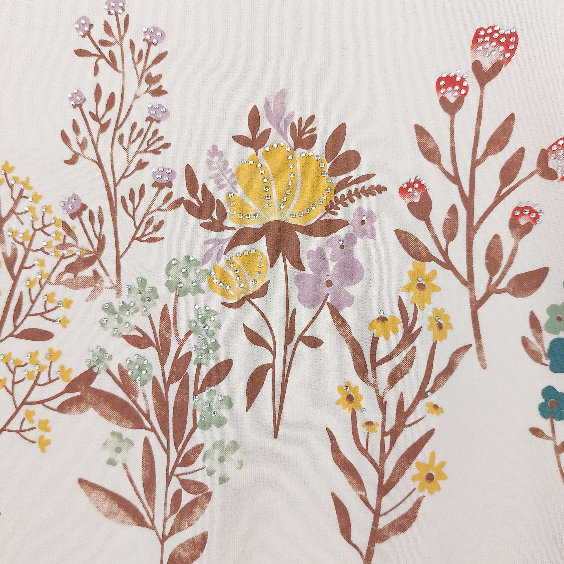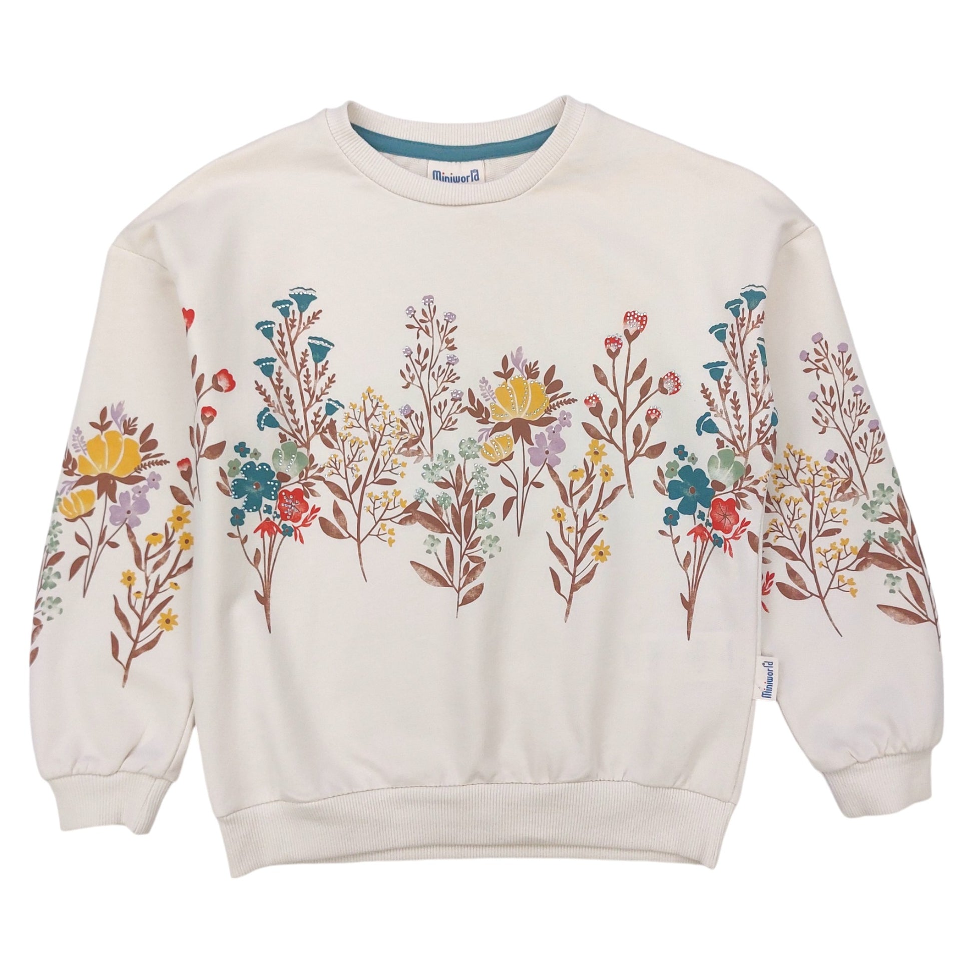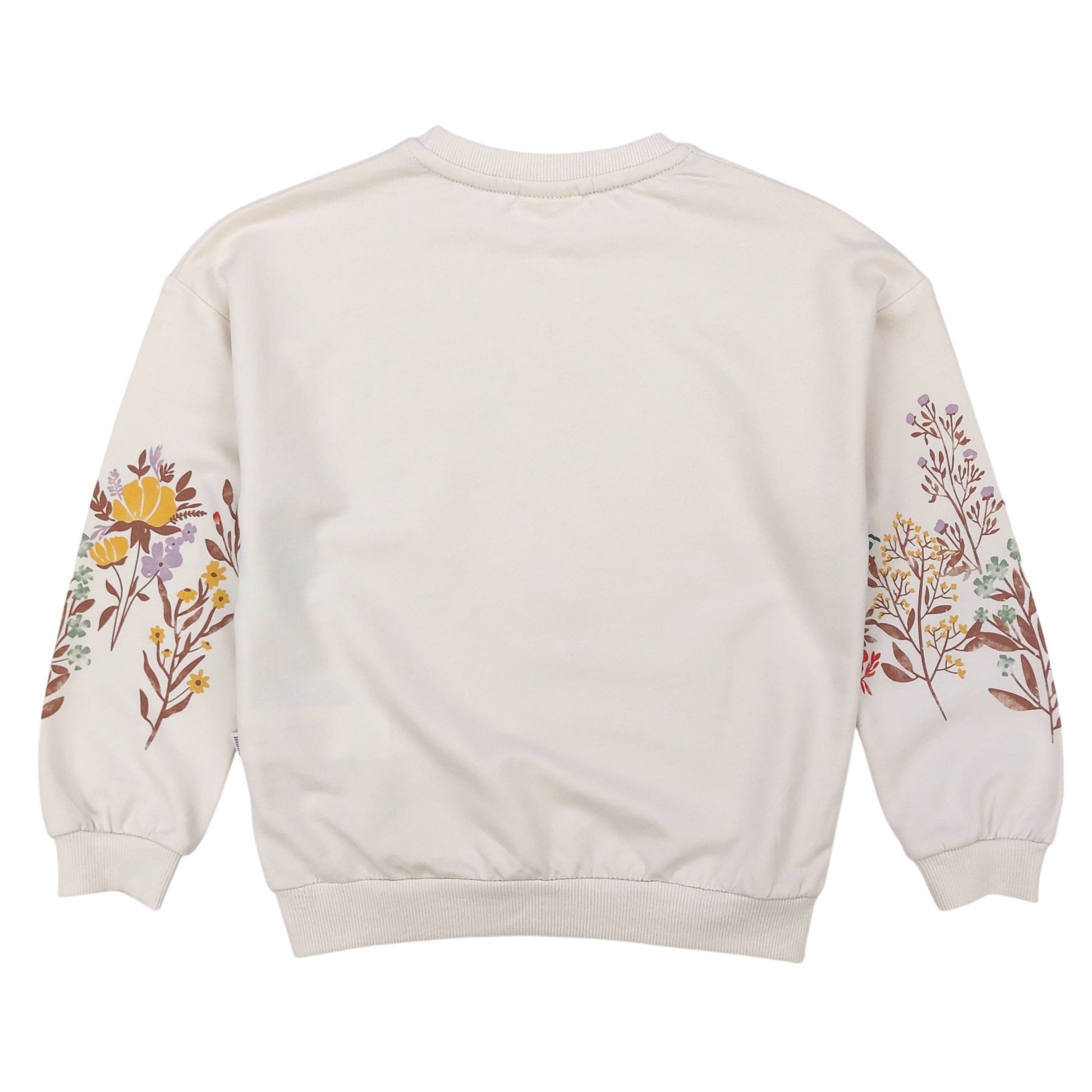 Sweatshirt: Dieses beige, locker sitzende Sweatshirt besticht durch einen dezenten Print mit leuchtenden Blumen. Der Print ist ein echter Hingucker und verleiht dem Sweatshirt eine leichte, mädchenhafte Note. Gerippte Bündchen und Saum sorgen für eine bequeme Passform und gleichzeitig Bewegungsfreiheit. Die perfekte Wahl für kühlere Tage, an denen Ihr Kind sowohl Wärme als auch Stil braucht.