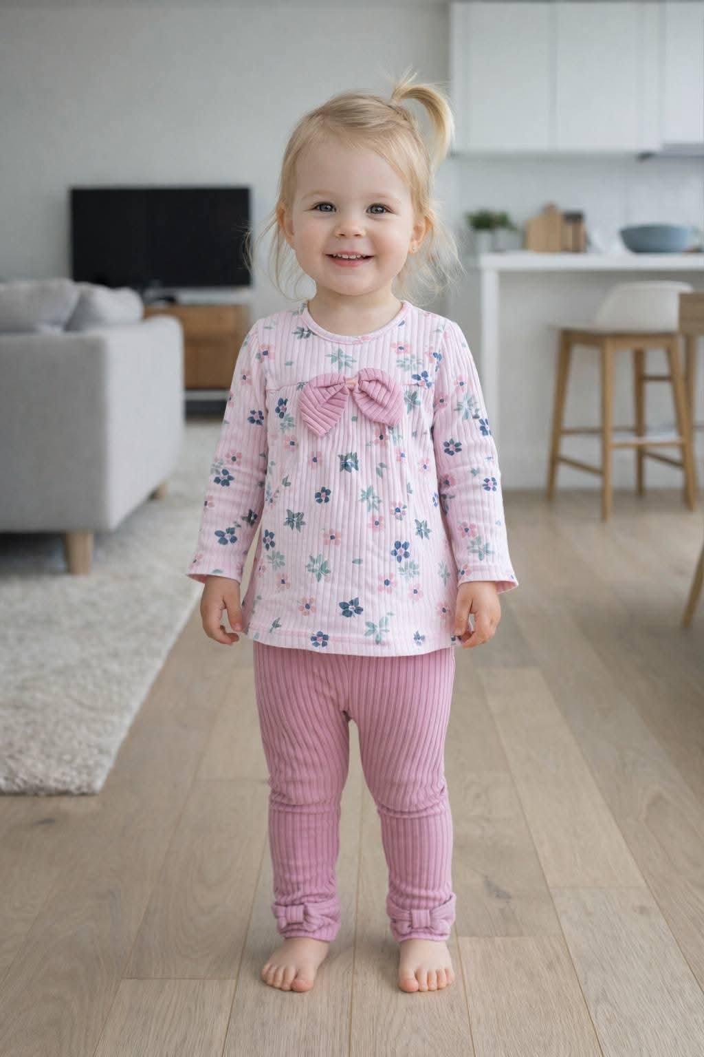 Dieses bezaubernde Blumen- Set für Mädchen ist die perfekte Wahl für Herbst und Winter. Aus weicher Baumwolle gefertigt, bietet es Komfort und Wärme. Das Set besteht aus zwei Teilen: einem langärmeligen Oberteil und einer Hose. Das Oberteil ist zartrosa mit einem Blumenmuster, die Hose einfarbig – so entsteht ein harmonischer Look. Ideal für kleine Mädchen, die Wert auf Komfort und Stil legen. Das Set hat keine Taschen oder Verschlüsse und lässt sich daher leicht anziehen.