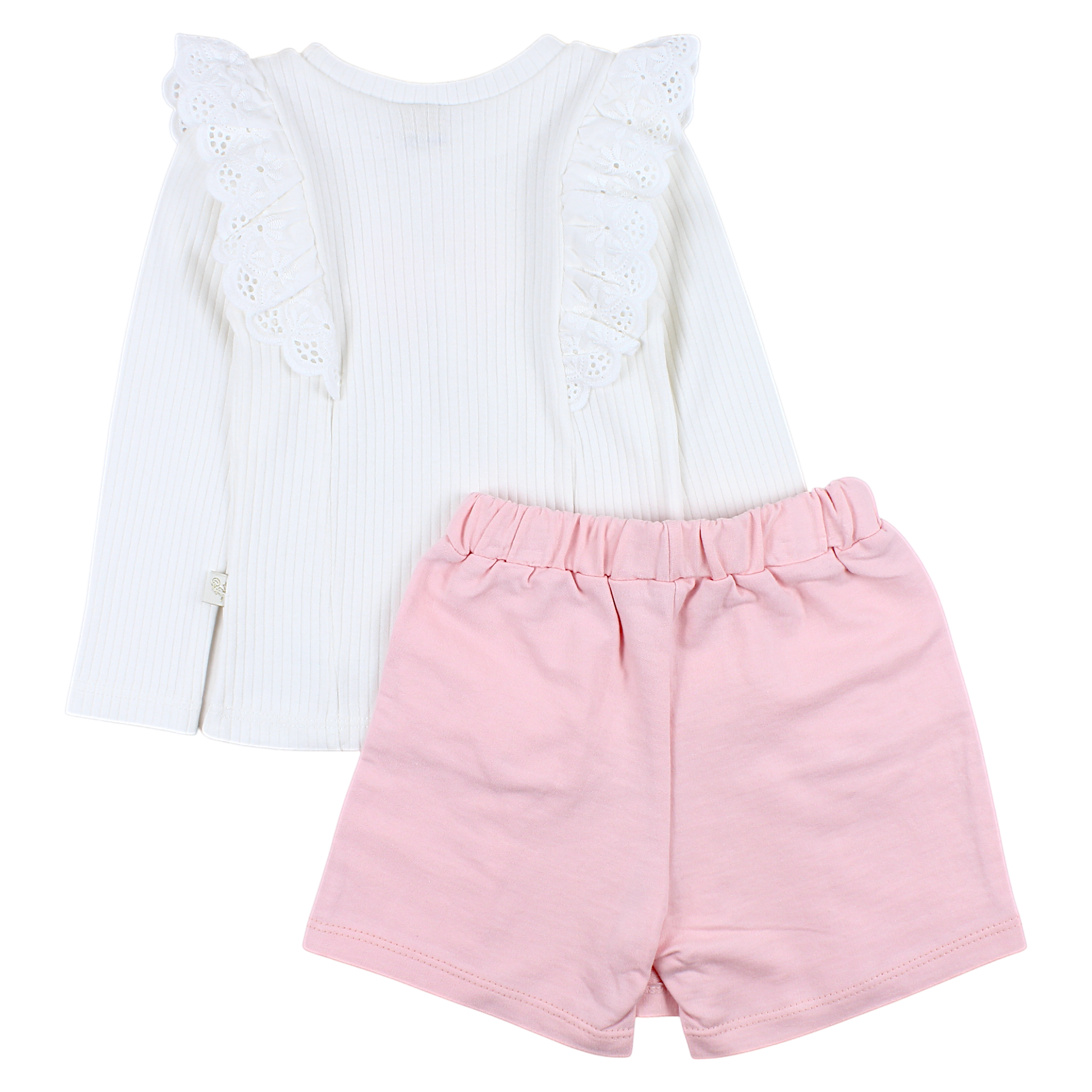 Dieses bezaubernde cremefarbene Set für Mädchen besticht durch zartrosa Akzente. Es besteht aus einer langärmeligen Bluse mit Rüschen an den Schultern und einer hübschen Schleife auf der Vorderseite. Zum Set gehören außerdem bequeme Rock-Shorts mit elastischem Bund und dekorativen Schleifen. Die perfekte Wahl für Frühlings- und Sommertage.