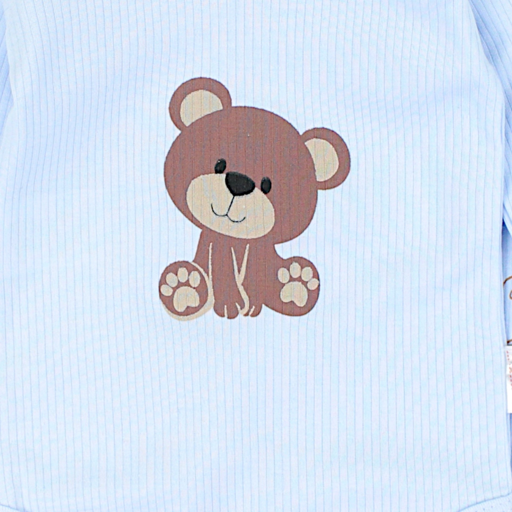Ein bezauberndes Babyset bestehend aus einem langärmeligen Body und Schlafanzügen in Pastellblau . Aus weicher Baumwolle gefertigt, bietet es Komfort und Behaglichkeit für Babys zarte Haut. Der Body ist mit einem süßen Teddybär- Print verziert, und die Shorts haben ein kleines Bärenmuster. Druckknöpfe an den Schultern und im Schritt erleichtern das An- und Ausziehen. Der elastische Bund der Schlafanzüge sorgt für Komfort. Eine ideale Wahl für einen Jungen für den Alltag und besondere Anlässe.