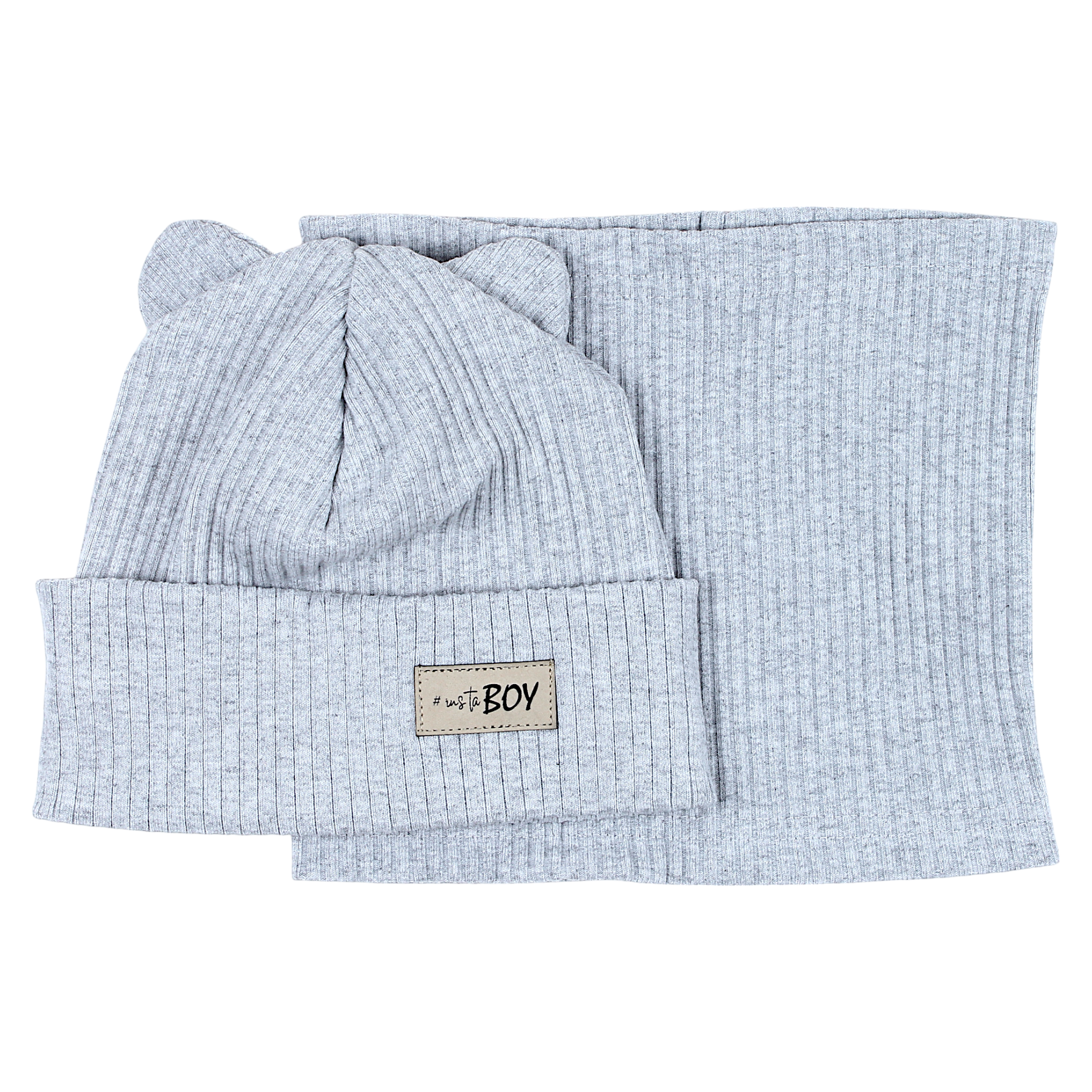 Ein stilvolles und praktisches Set für Jungen, bestehend aus einer Mütze mit Ohren und einem Schal , perfekt für Frühlings- und Sommertage. Die Kindermütze besteht aus weichem, dehnbarem aschgrauem Stoff, der sich dem Kopf des Kindes anpasst und für Komfort und Bequemlichkeit sorgt. Der Schal schützt vor kalter Luft, ohne die Bewegungsfreiheit des Kindes einzuschränken. Dieses Modell zeichnet sich durch modisches Rippmaterial und einen dekorativen Patch mit der Aufschrift „It's a BOY“ aus.