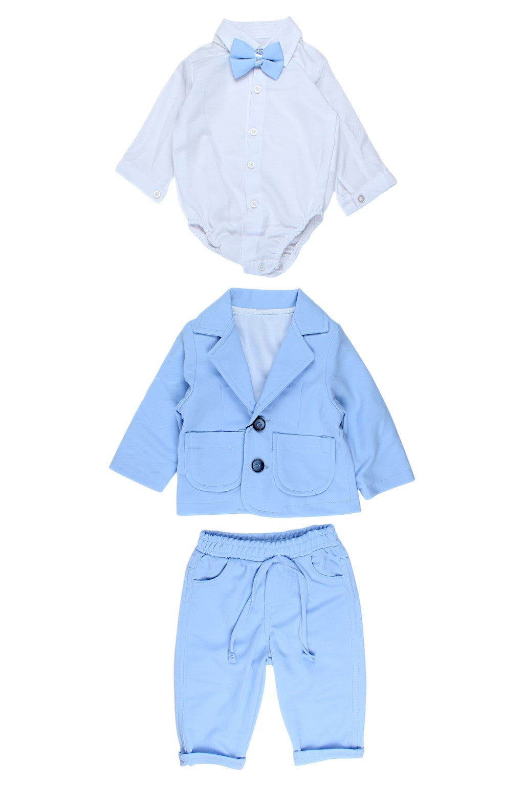 Wir präsentieren ein elegantes blaues Jungen-Set von Emiclass . Es besteht aus vier Teilen: einem Hemd-Body mit Fliege, einer Jacke und einer Hose (Schuhe nicht enthalten). Der Hemd-Body besticht durch eine elegante Fliege, die ihm eine schicke Note verleiht. Die Jacke hat einen klassischen Schnitt mit Taschen, und die Hose ist bequem und modisch. Perfekt für besondere Anlässe – dieses Set bietet jedem Jungen Komfort und Eleganz.