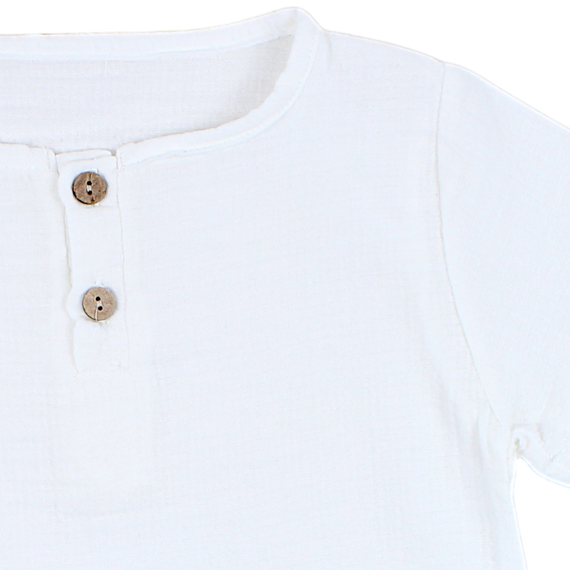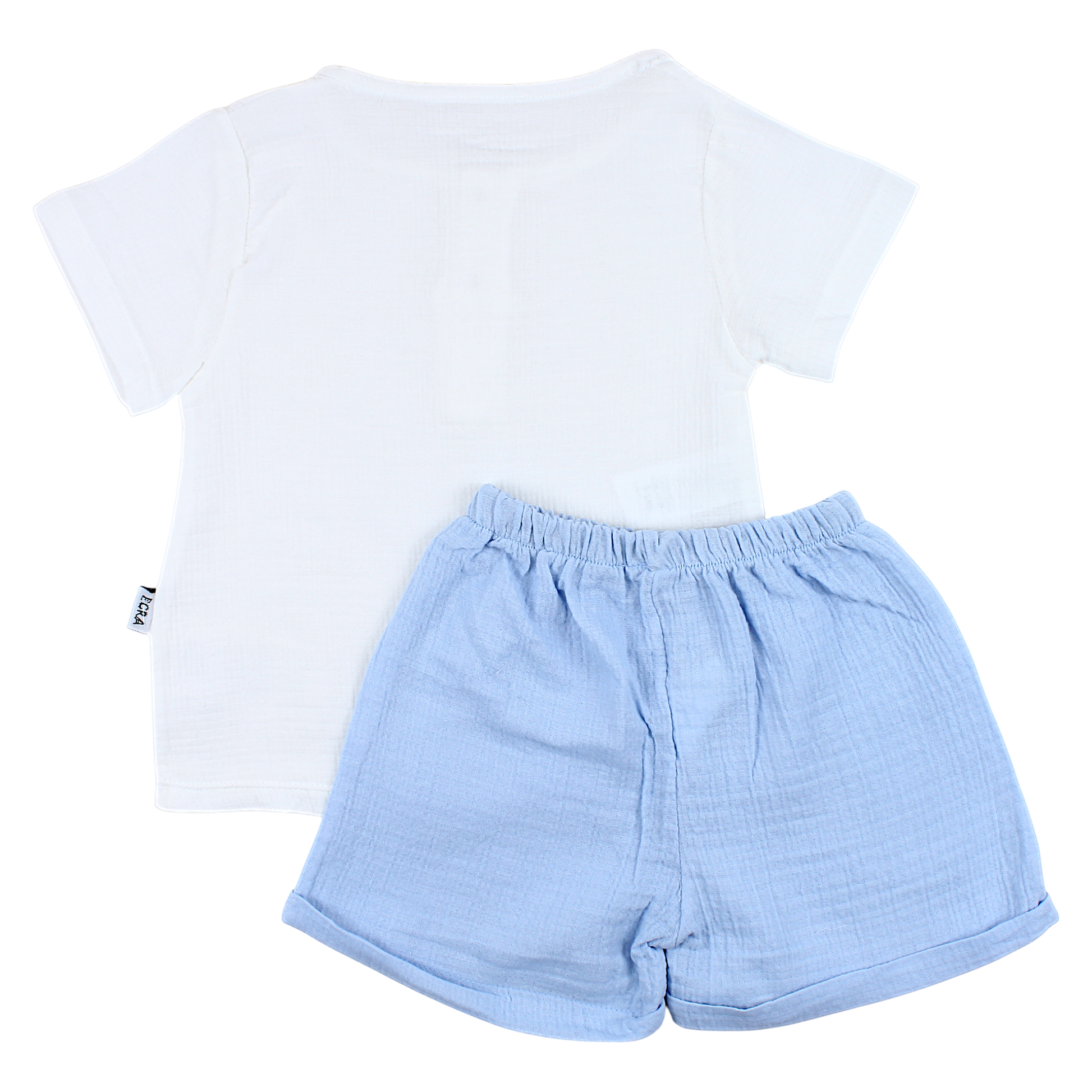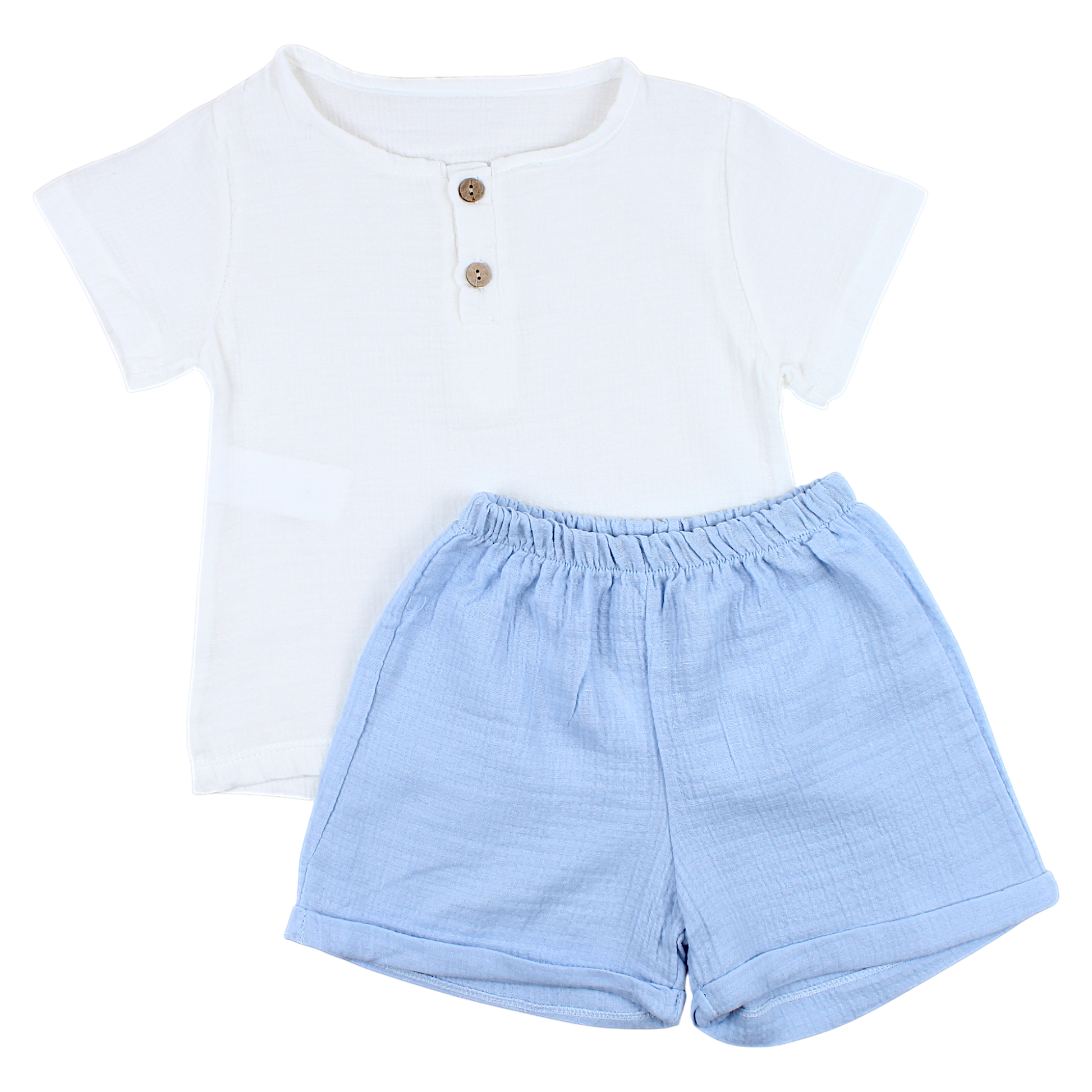 Dieses Musselin-Set für Kinder ist die perfekte Wahl für die Frühling-Sommer-Saison. Das ecrufarbene T-Shirt hat kurze Ärmel und einen runden Ausschnitt mit zwei Holzknöpfen , die seinen Charme noch verstärken. Die hellblauen Shorts haben einen elastischen Bund für mehr Komfort. Sie sind aus zartem Musselin gefertigt, sind atmungsaktiv und bequem . Perfekt für Jungen an warmen Tagen.