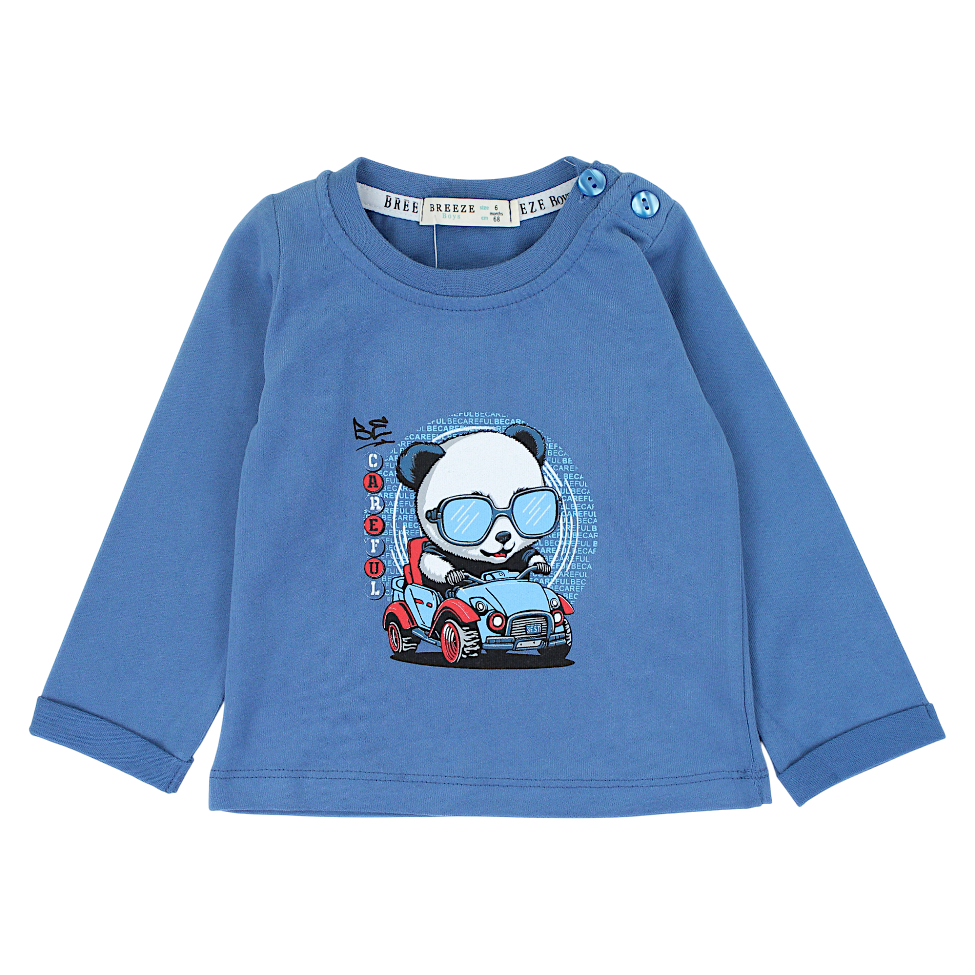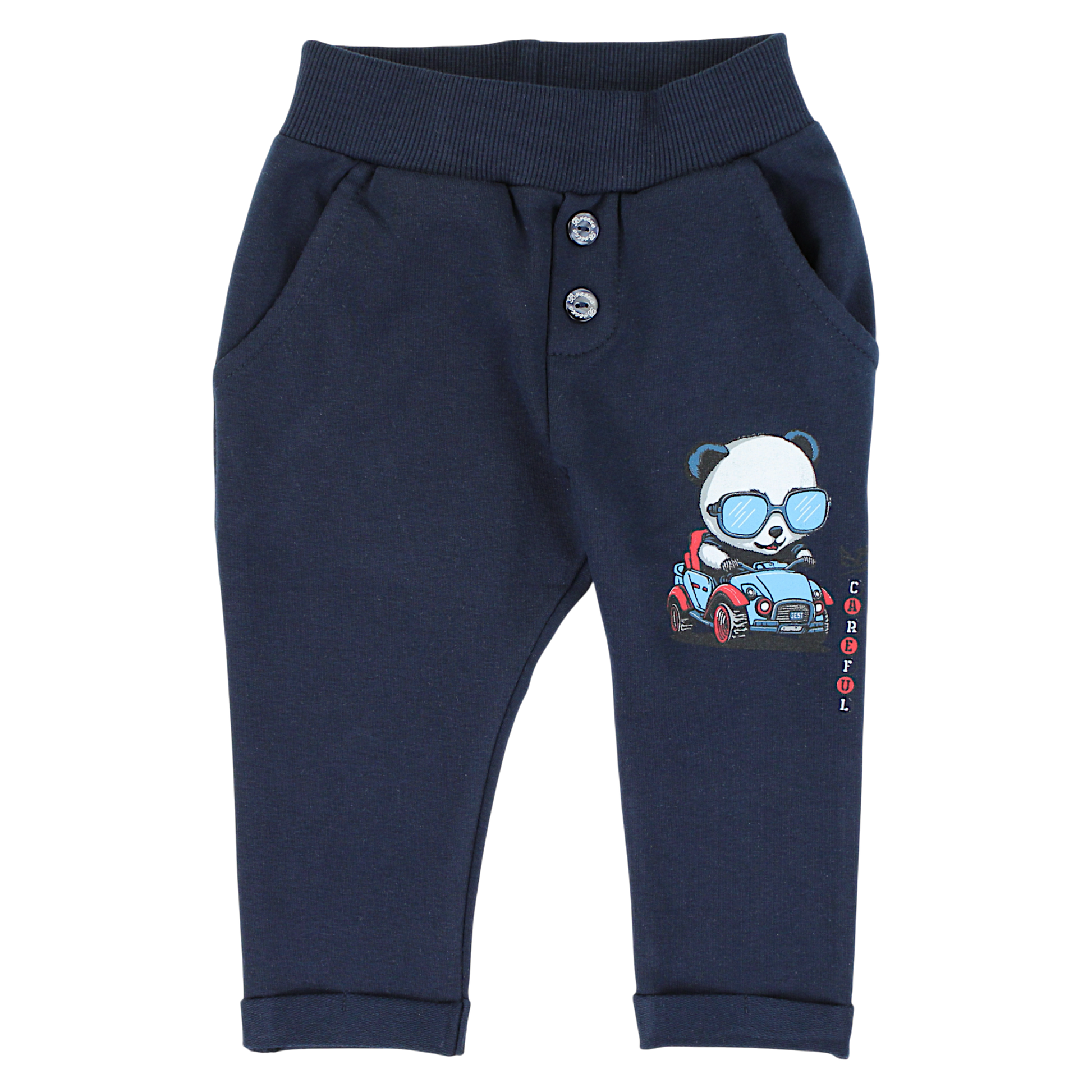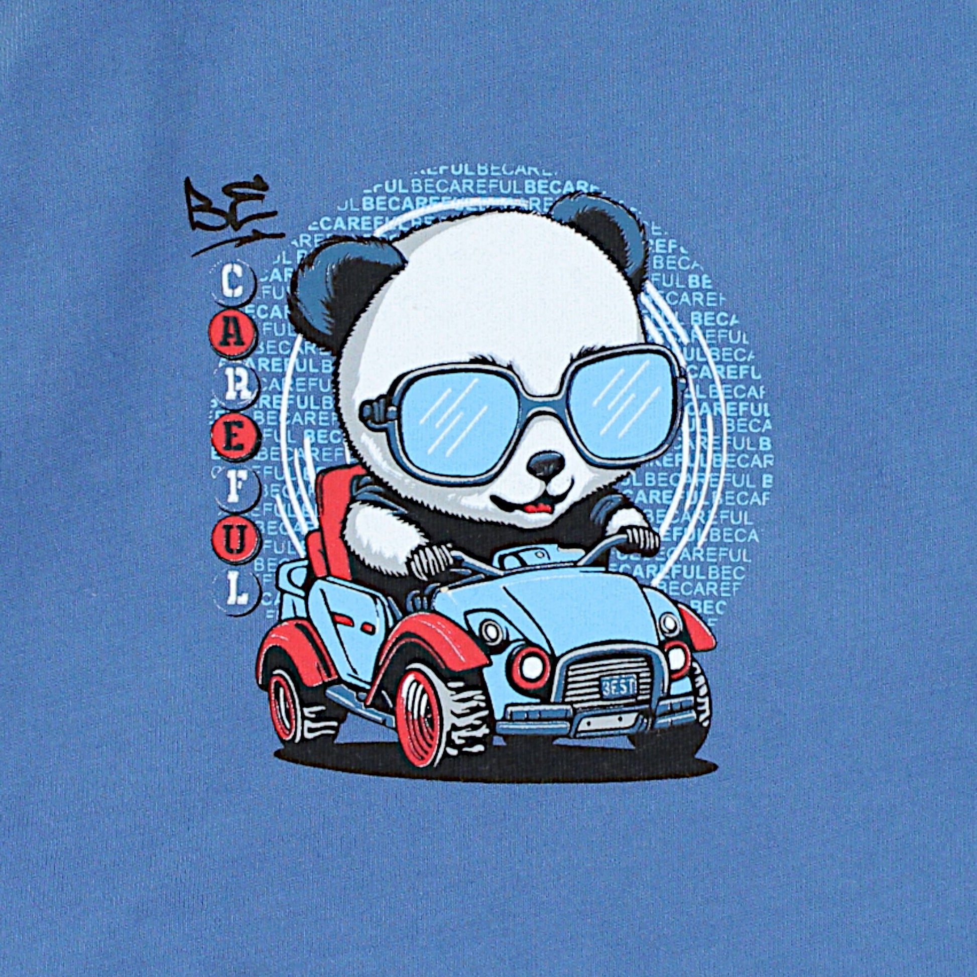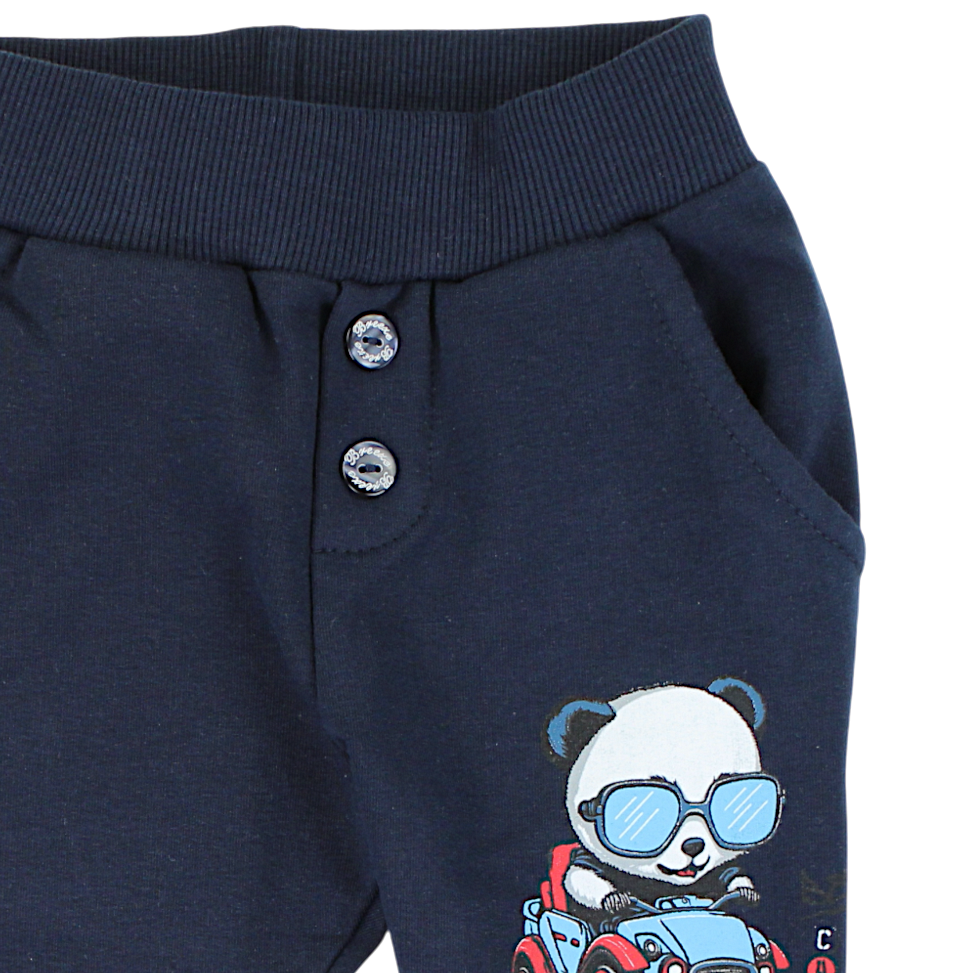 Das Trainingsanzug-Set für Jungen besteht aus einem langärmeligen Oberteil und einer Jogginghose . Das blaue Oberteil zeigt einen niedlichen Aufdruck eines bebrillten Pandas, der Auto fährt, mit der Aufschrift „BE CAREFUL“. Ein Zwei-Knopf-Verschluss an der Schulter erleichtert das Anziehen. Die marineblaue Hose mit passendem Aufdruck hat einen elastischen Bund und Bündchen für mehr Komfort.