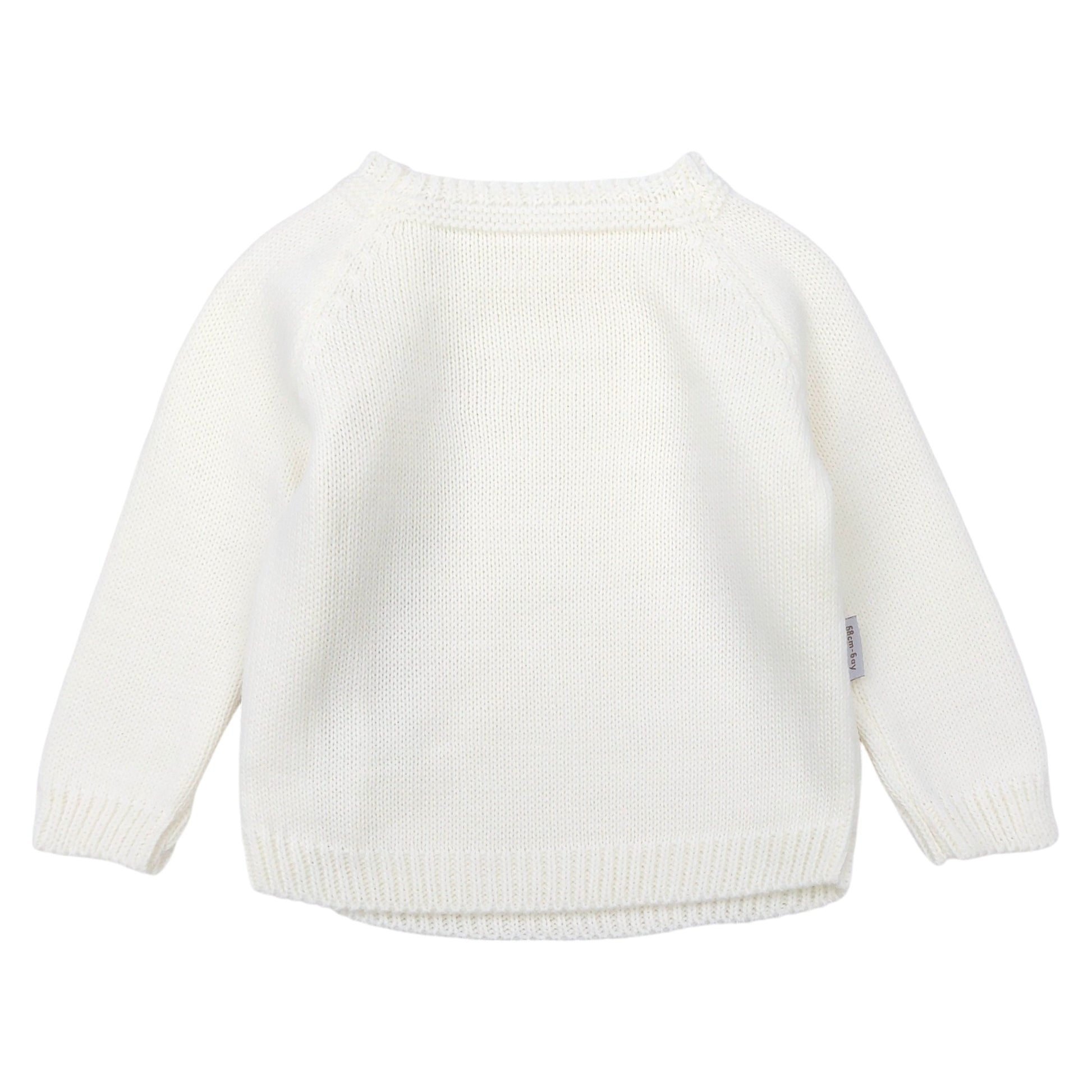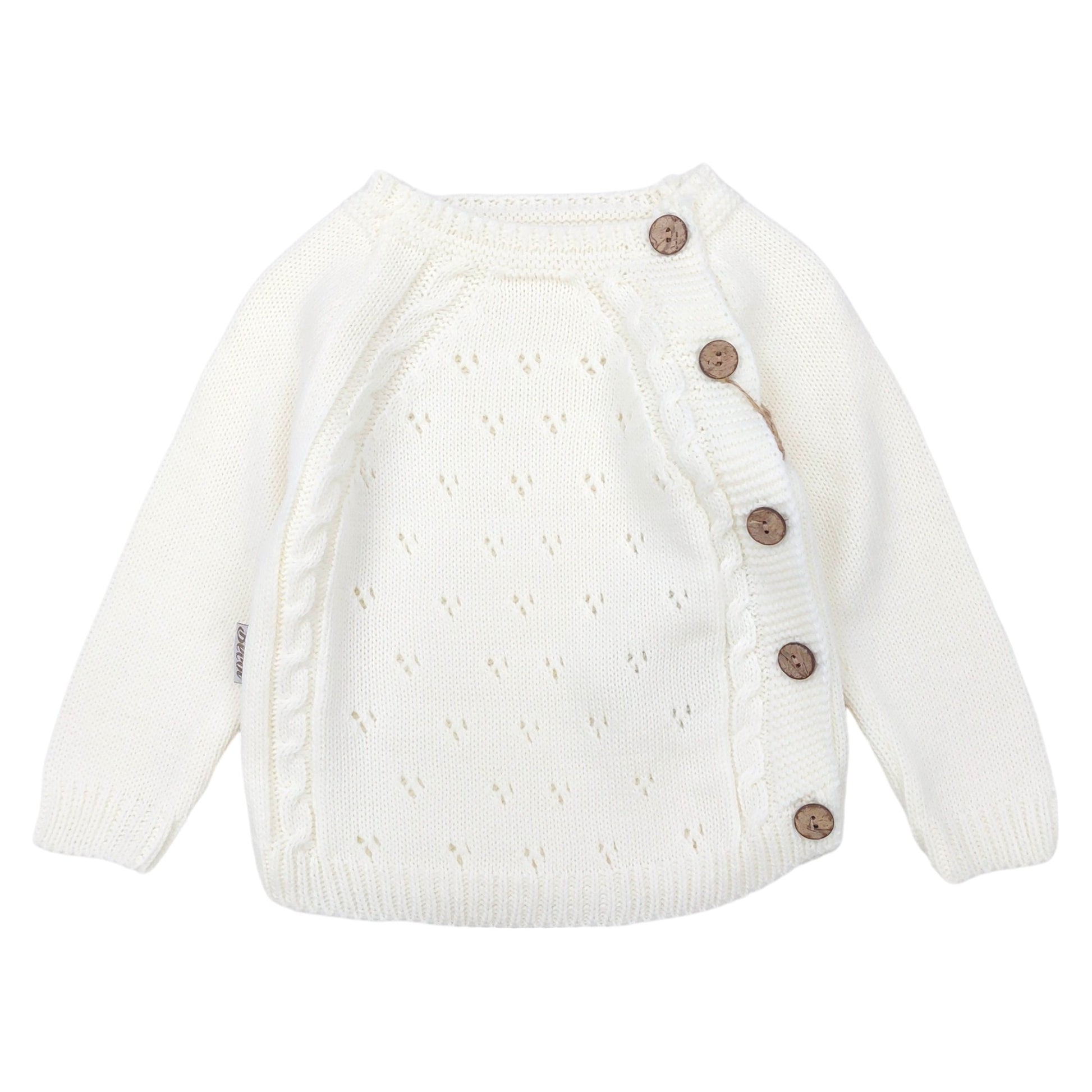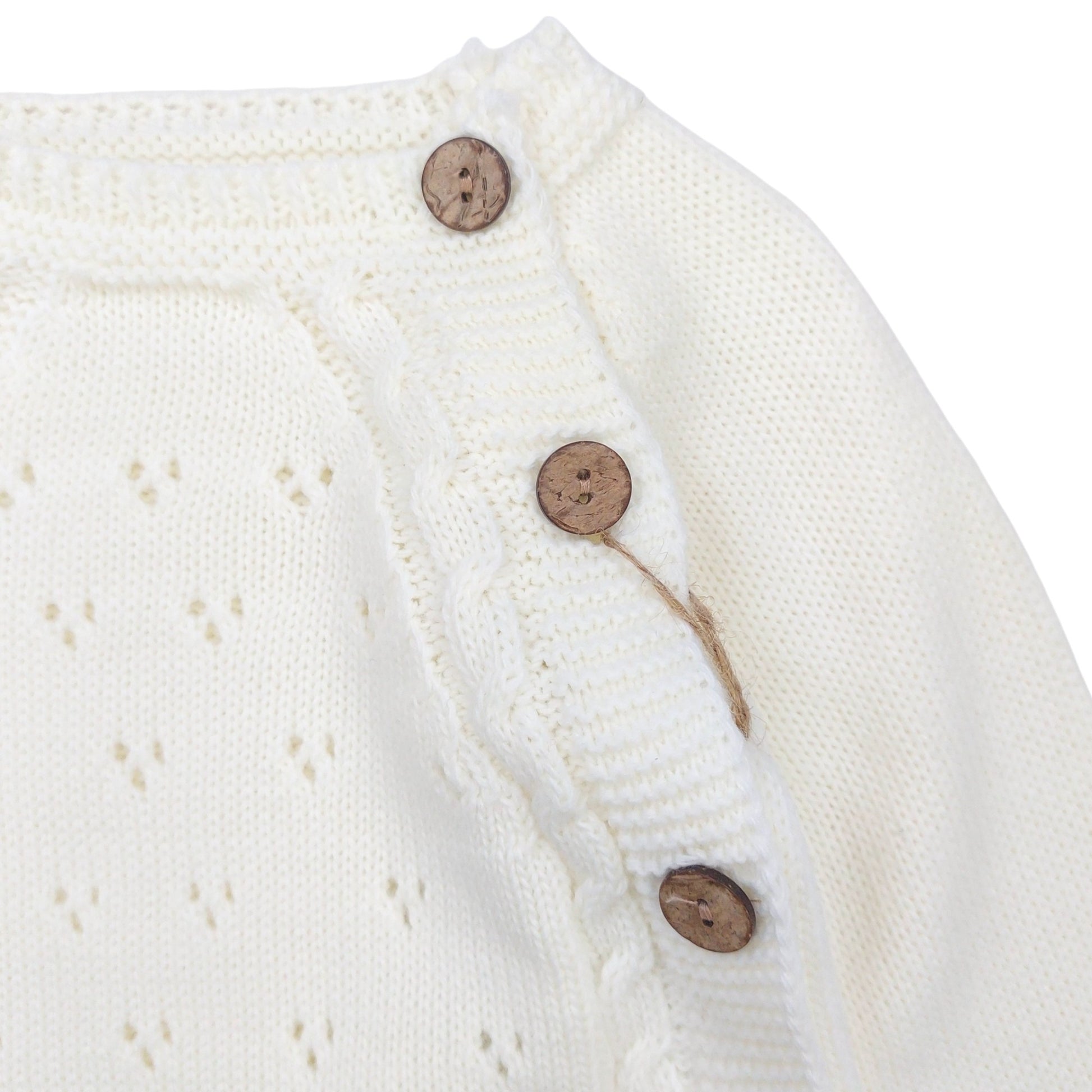 Ein Pullover mit seitlichem Verschluss Holzknöpfe Es besticht nicht nur durch seine Zweckmäßigkeit, sondern auch durch das charmante, zarte Muster auf der Vorderseite. Diese subtilen Details verleihen dem Set einen einzigartigen Charakter und machen es sowohl für den Alltag als auch für formellere Anlässe perfekt. Set für Mädchen in Cremefarbe ist ein universelles Angebot, das sich problemlos in verschiedene Stile einfügt.