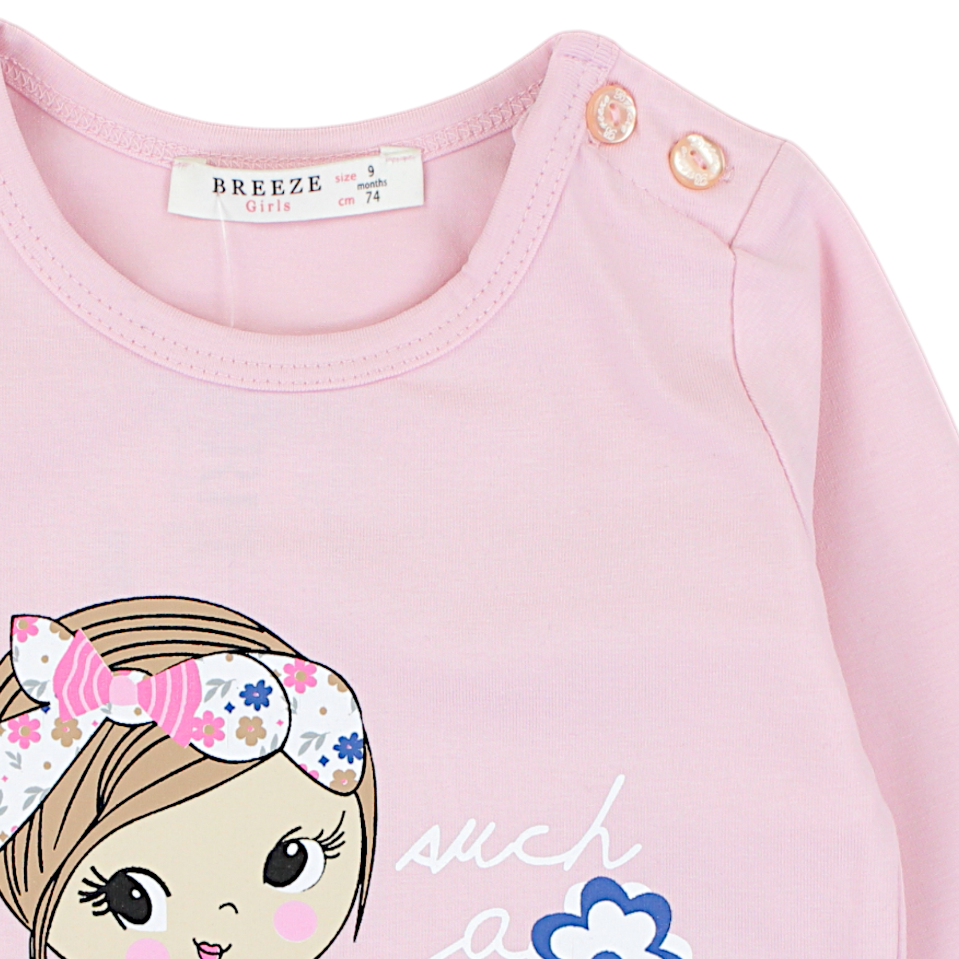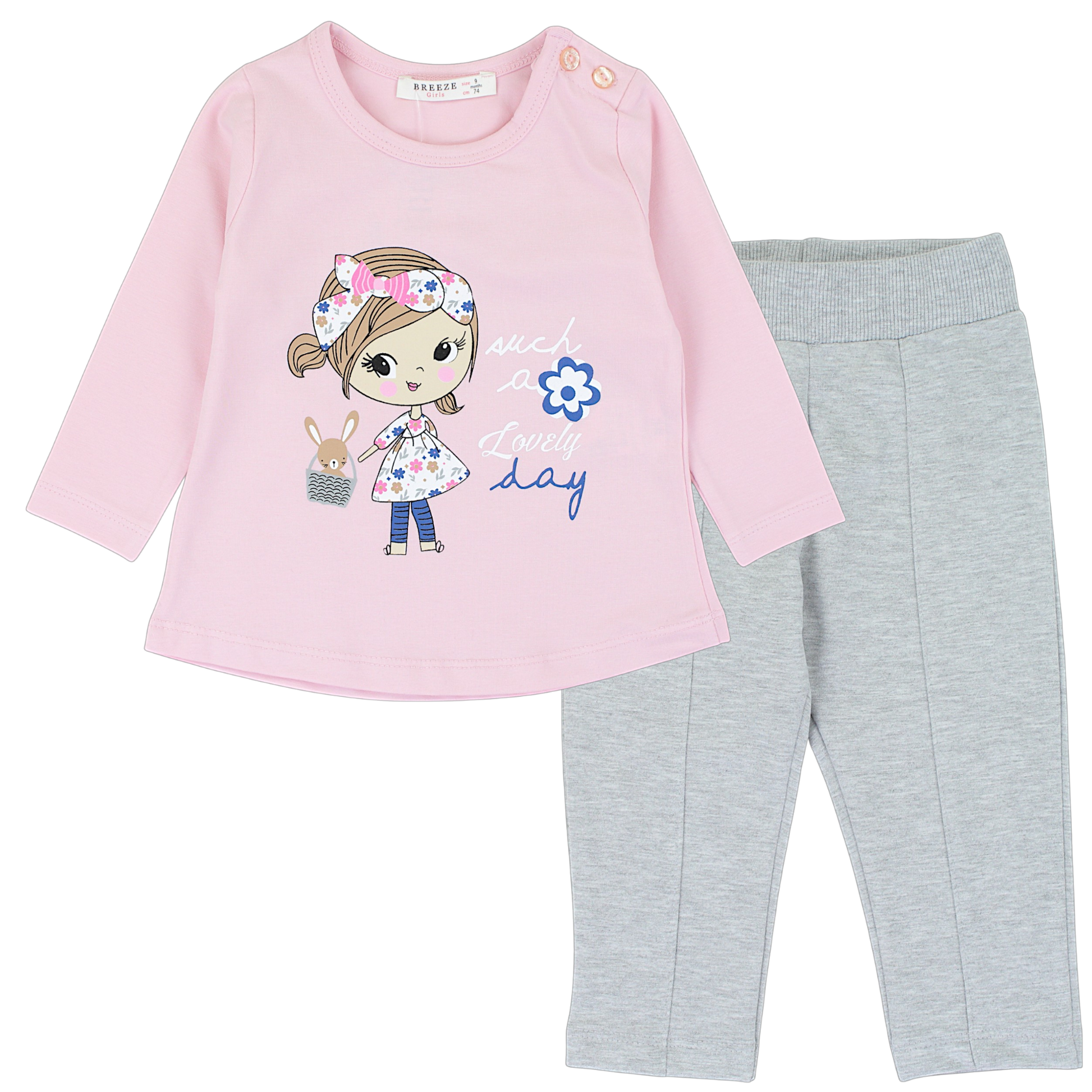 Dieses bezaubernde Mädchen-Set von Breeze besteht aus einer rosa Langarmbluse und einer grauen Hose . Die Bluse ist mit einem Mädchenmotiv mit Schleife und dem Schriftzug „such a lovely day“ verziert. Der praktische Zwei-Knopf-Schulterverschluss erleichtert das An- und Ausziehen. Die Hose ist weich und hat einen elastischen Bund für mehr Komfort. Die perfekte Wahl für den Alltag und ein aktives Kleinkind.