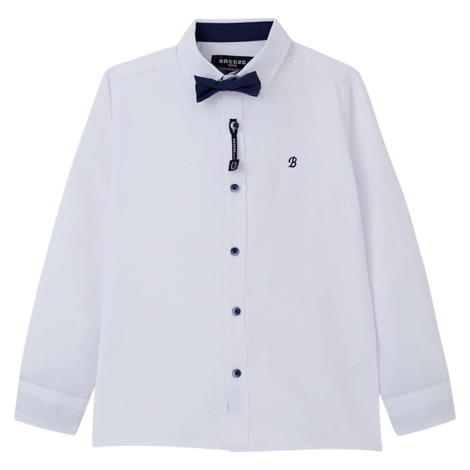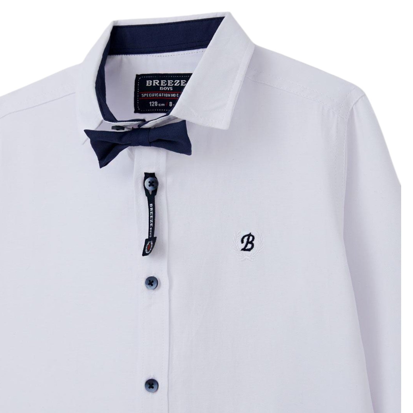 Wir präsentieren dieses elegante Breeze-Hemd , perfekt für Jungen für besondere Anlässe. Das Hemd ist in klassischem Weiß gehalten und somit ein vielseitiges Grundelement der Garderobe. Es verfügt über hochkrempelbare Ärmel , die auf eine kürzere Länge eingestellt werden können, wodurch es praktisch für verschiedene Wetterbedingungen ist. Die Vorderseite des Hemdes ist mit dezenten Knöpfen und einer dekorativen Fliege verziert, was dem gesamten Outfit eine elegante Note verleiht. Beachten Sie die kleinen Details, wie das gestickte B-Logo auf der Brust, das den anspruchsvollen Stil unterstreicht. Das Hemd wird mit Knöpfen geschlossen, wodurch es sich schnell an- und ausziehen lässt. Die Rückseite des Hemdes ist einfarbig und betont sein minimalistisches und dennoch elegantes Design. Das Hemd wird mit einer Fliege geliefert und ist somit ein komplettes Set für einzigartige, formelle Outfits. Entworfen für Jungen , ist es perfekt für Familienfeiern, Schulveranstaltungen oder andere formelle Anlässe. Das Hemd ist aus hochwertigem Stoff gefertigt und gewährleistet ganztägigen Tragekomfort.