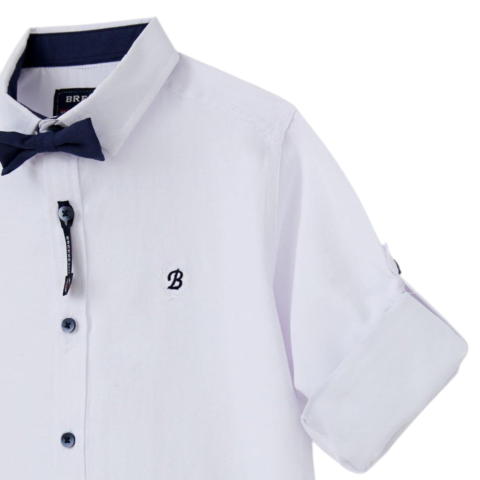 Dieses elegante weiße Hemd von Breeze für Jungen ist die perfekte Wahl für besondere Anlässe. Das Hemd hat kurze Ärmel mit hochkrempelbaren Manschetten, sodass Sie es an das Wetter und Ihren Stil anpassen können. Es verfügt über eine stilvolle Button- Down-Front und eine dekorative Fliege. Zusätzlich ziert das Hemd ein fein gesticktes B-Logo auf der Brust. Die elegante Verarbeitung und der hochwertige Stoff machen es zur perfekten Wahl für jeden Anlass.
