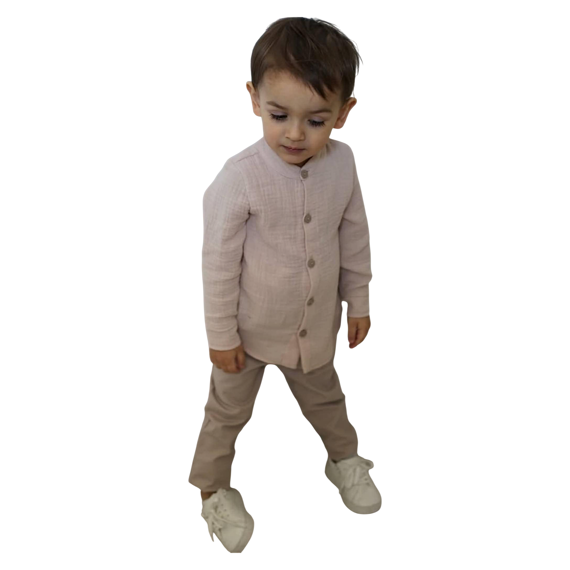 Dieses elegante beige Musselin-Hemd für Jungen von Royal Kids ist aus weichem und atmungsaktivem Stoff gefertigt und perfekt für Frühling und Sommer . Der Stehkragen sorgt für einen schicken Look. Das Hemd lässt sich mit Knöpfen leicht an- und ausziehen. Es hat keine Taschen und wirkt dadurch schlicht und elegant – perfekt für besondere Anlässe.