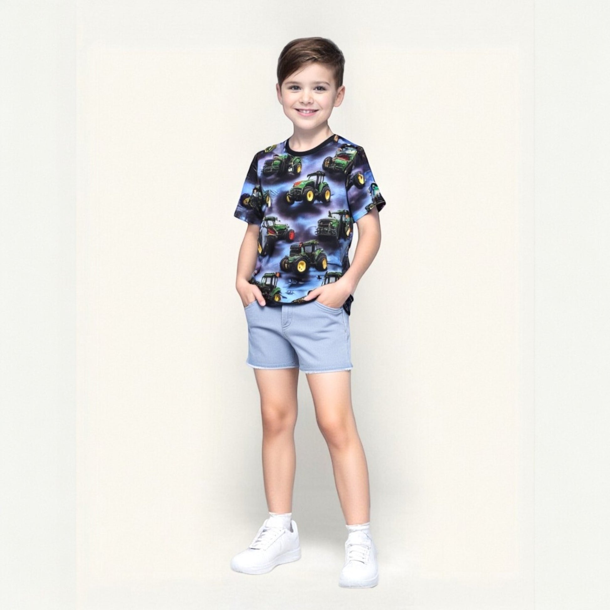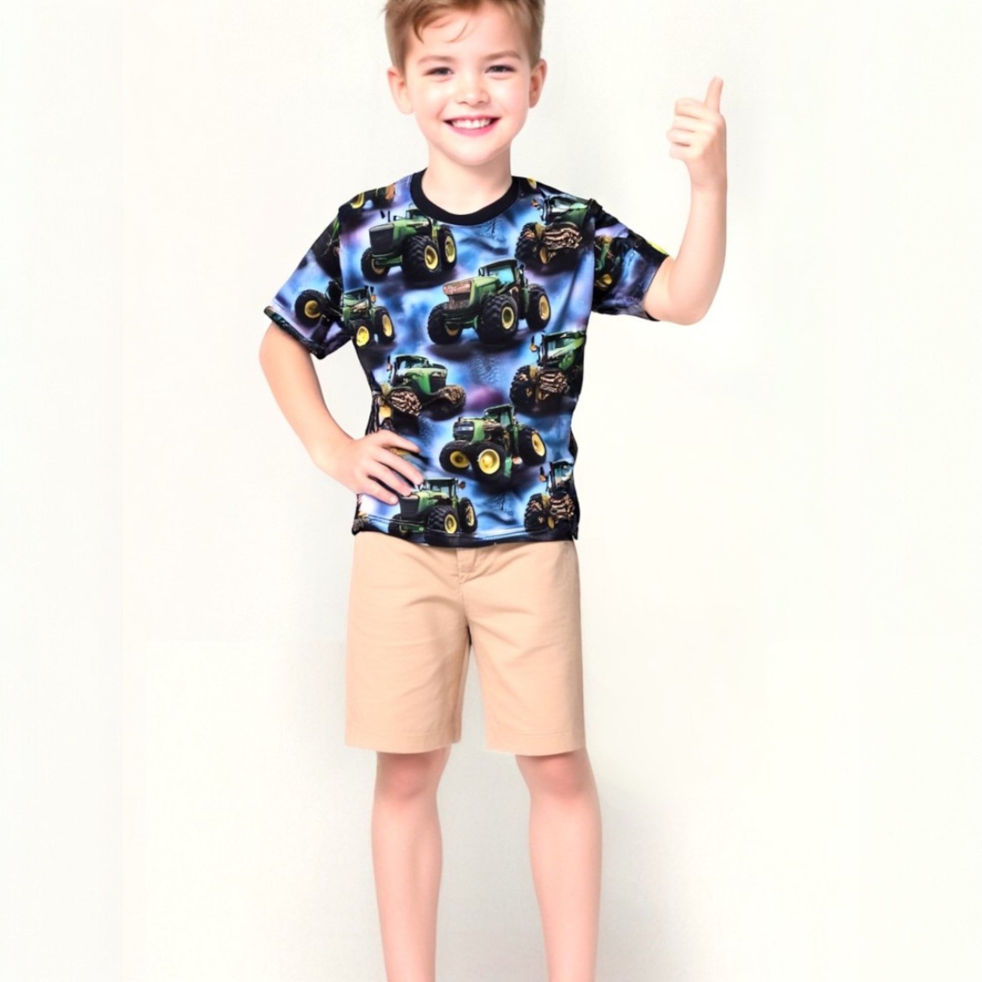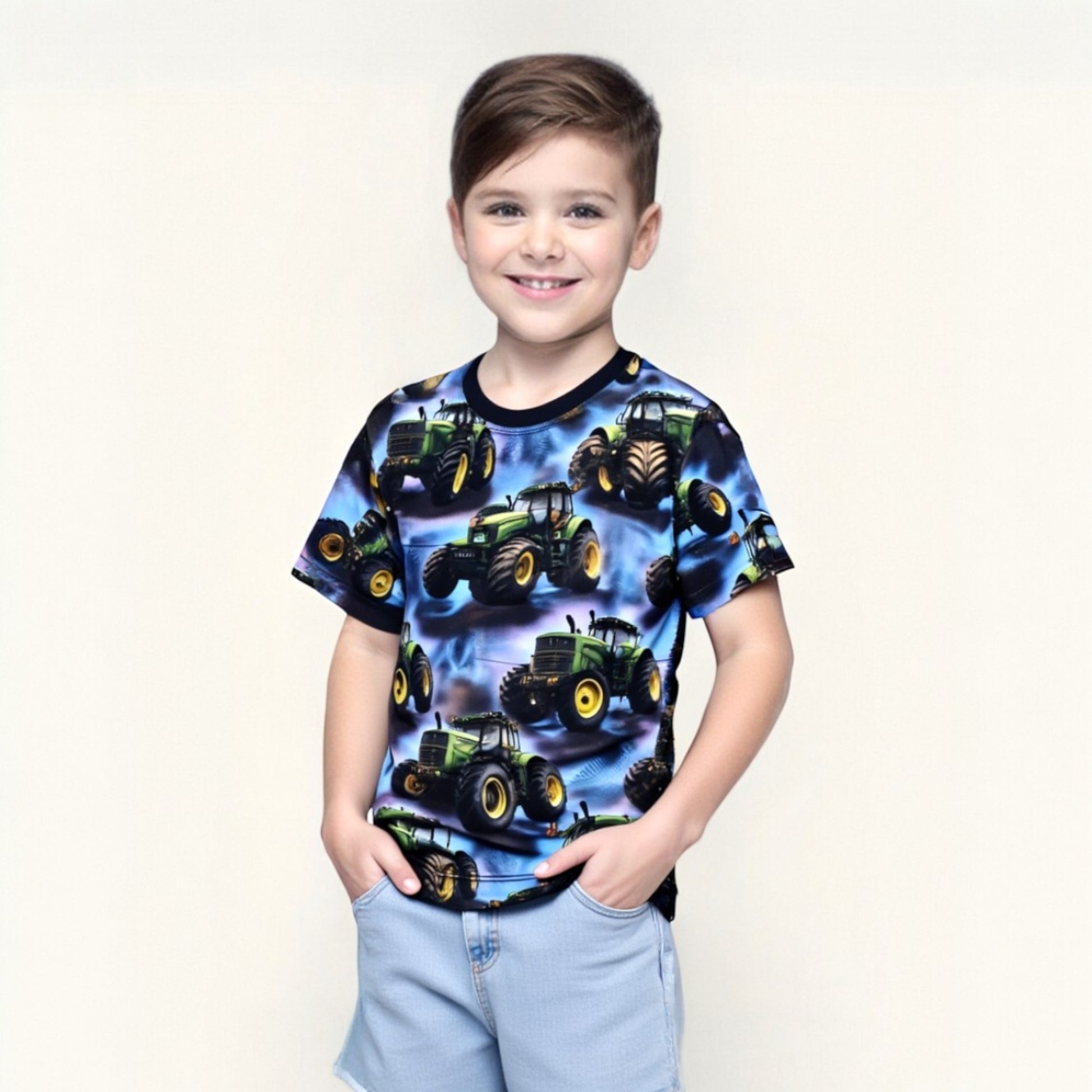 Dieses blaue Traktor-T-Shirt für Jungen ist die perfekte Wahl für junge Landmaschinen-Fans. Das bequeme Material bietet Komfort für jeden Tag. Realistische Traktormuster in dynamischen Posen ziehen die Blicke auf sich. Kurze Ärmel und ein klassischer Rundhalsausschnitt sorgen für einen vielseitigen Look. Das T-Shirt hat weder Taschen noch Verschlüsse und lässt sich daher leicht anziehen und tragen. Die leuchtenden Farben und die detaillierten Grafiken unterstreichen den jungenhaften Charakter des Kleidungsstücks.
