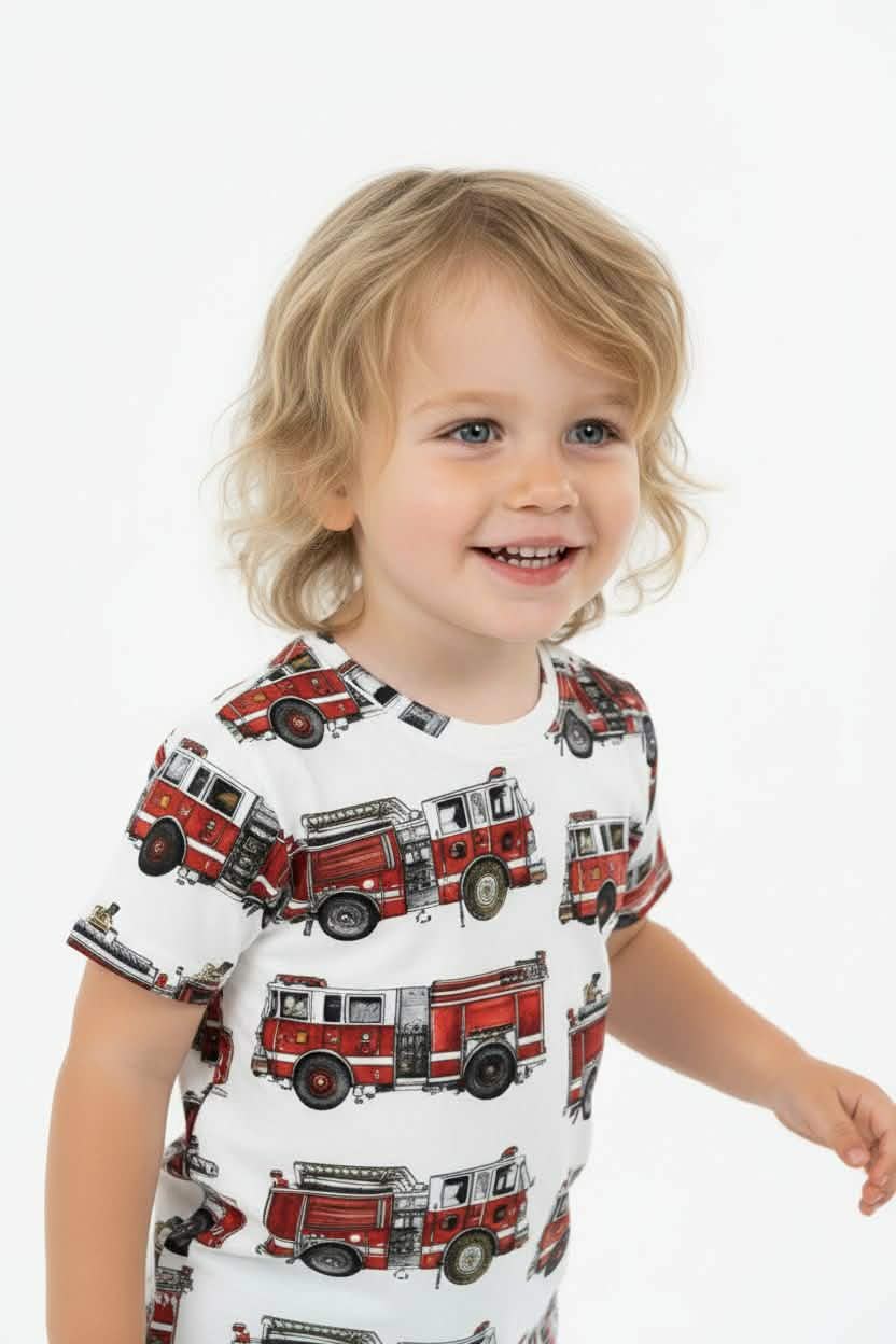Chłopięca koszulka z motywem wozu strażackiego w kolorze czerwonym