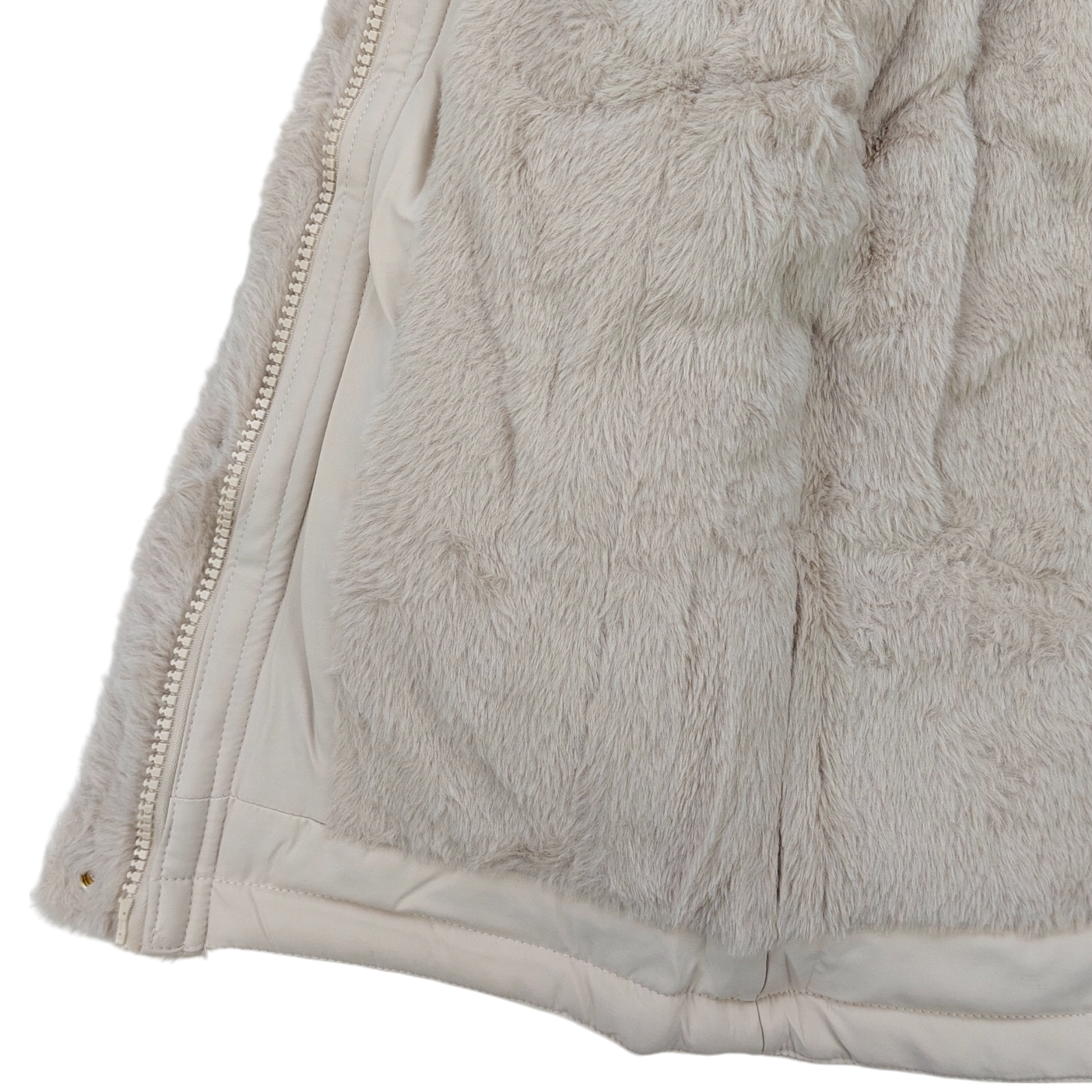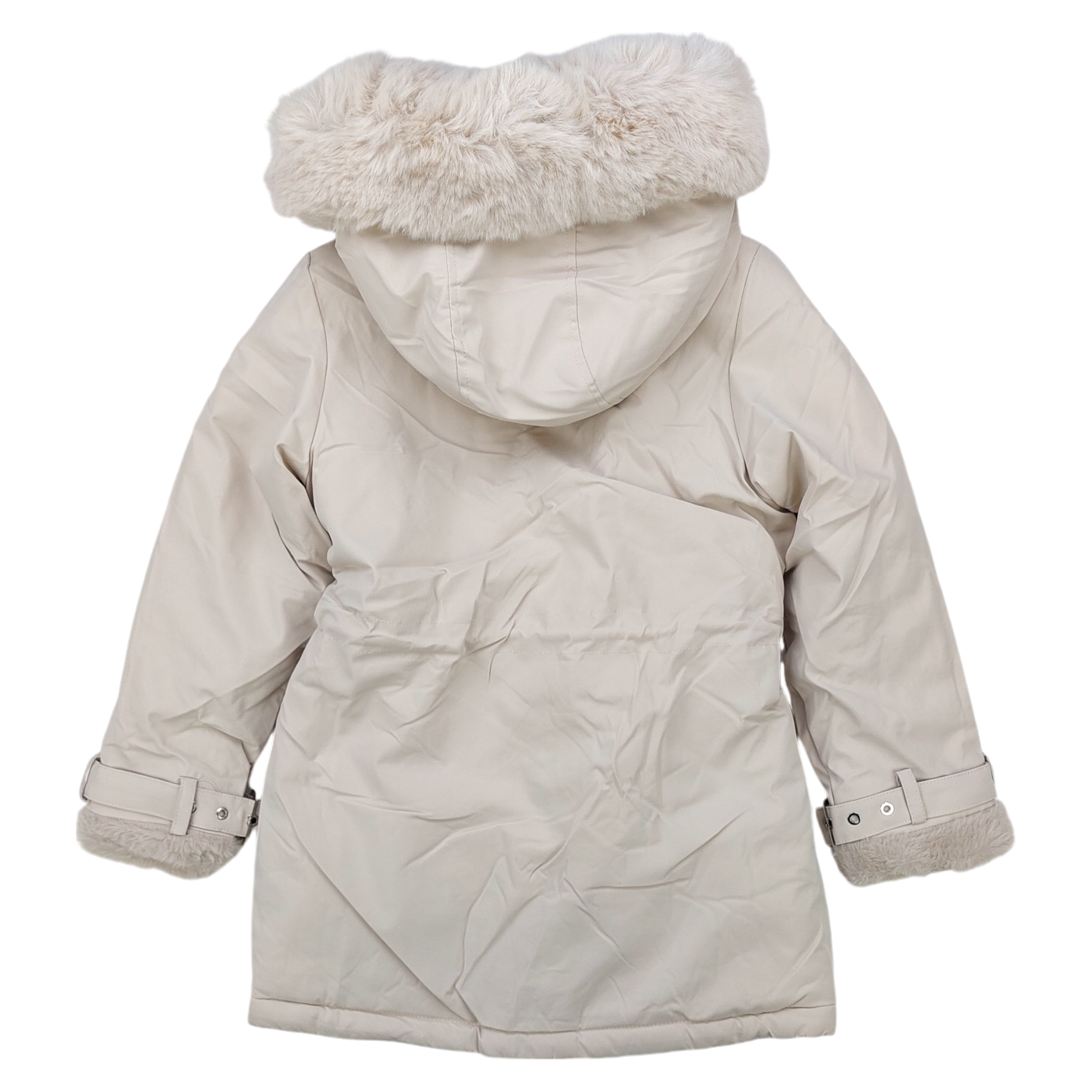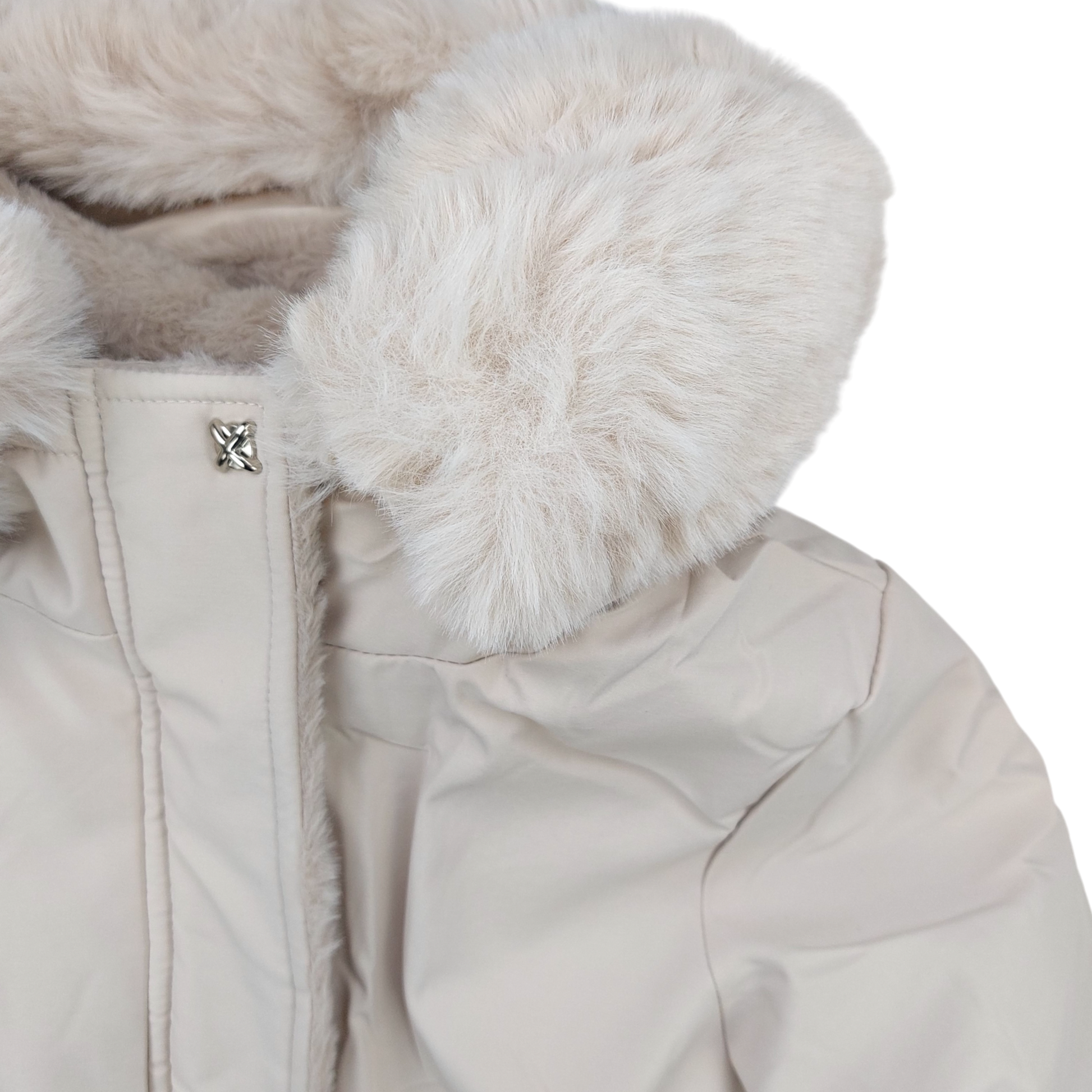 Eleganter und warmer Winterparka in Beige für Mädchen aus der Herbst-/Winterkollektion . Die Jacke verfügt über eine abnehmbare Kapuze mit auffälligem Kunstfellbesatz und lange, verstellbare Ärmel . Zwei Taschen mit Druckknopfverschluss eignen sich perfekt zum Verstauen kleiner Gegenstände. Die taillierte Passform sorgt für eine bessere Passform und einen stylischen Touch. Das Teddyfutter sorgt auch an kältesten Tagen für Wärme.