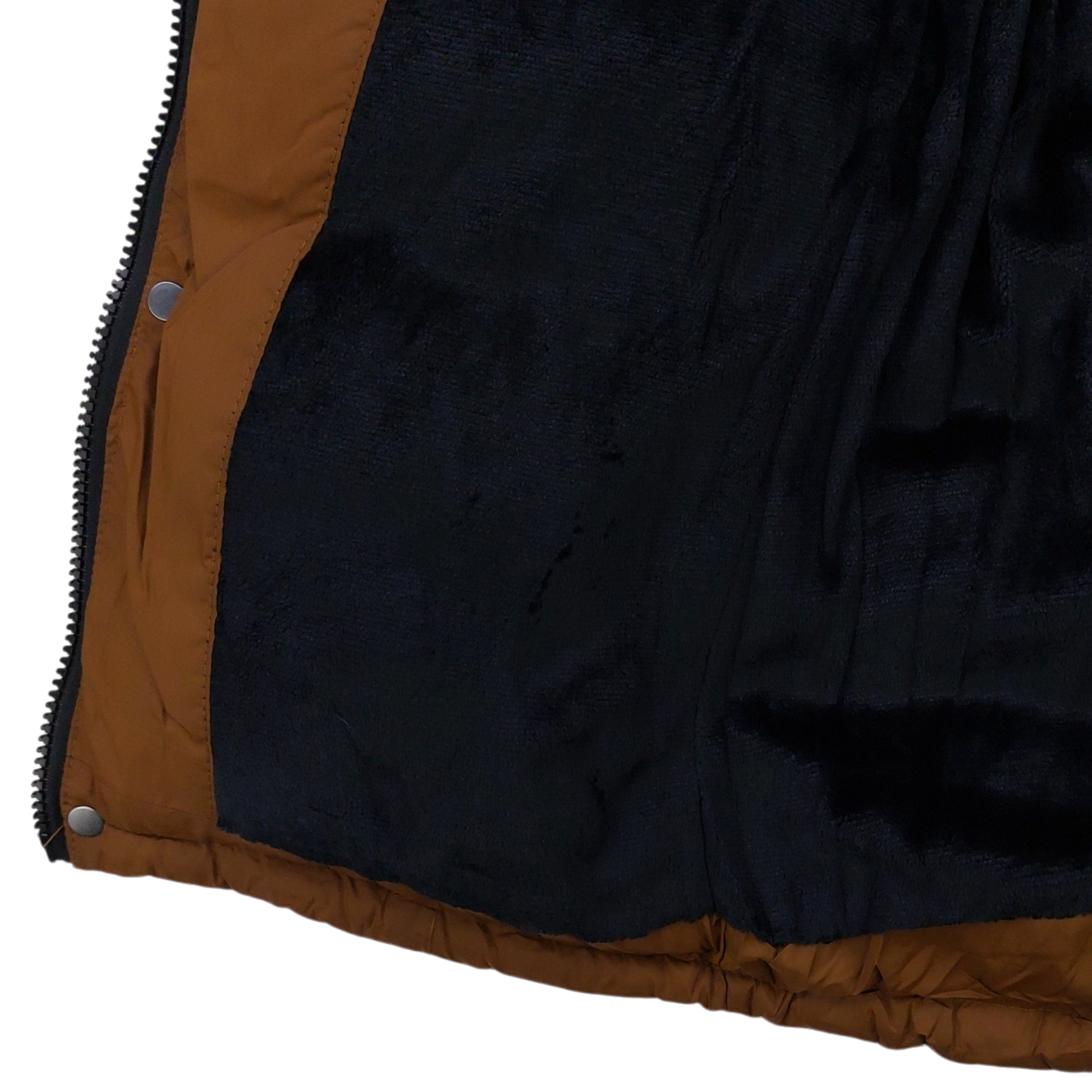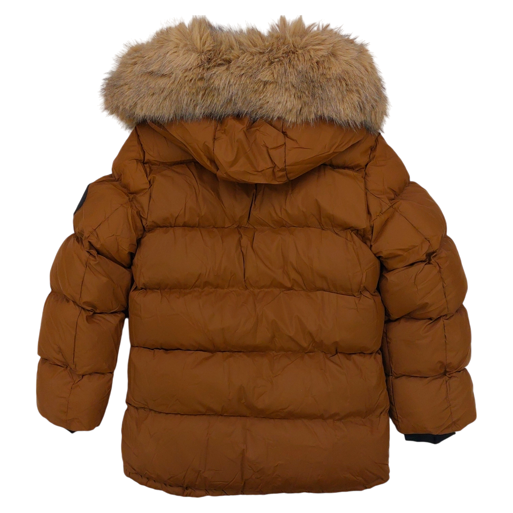 Eine stilvolle camelfarbene Winterjacke für Jungen aus der Herbst-/Winterkollektion . Die abnehmbare Kapuze mit Kunstfellbesatz verleiht der Jacke einen eleganten Touch und bietet zusätzlichen Schutz vor Kälte. Lange Ärmel und elastische Bündchen sorgen für Tragekomfort, während praktische Reißverschlusstaschen Stauraum für Kleinigkeiten bieten. Ein Reißverschluss mit zusätzlicher Druckknopfleiste bietet umfassenden Kälteschutz.