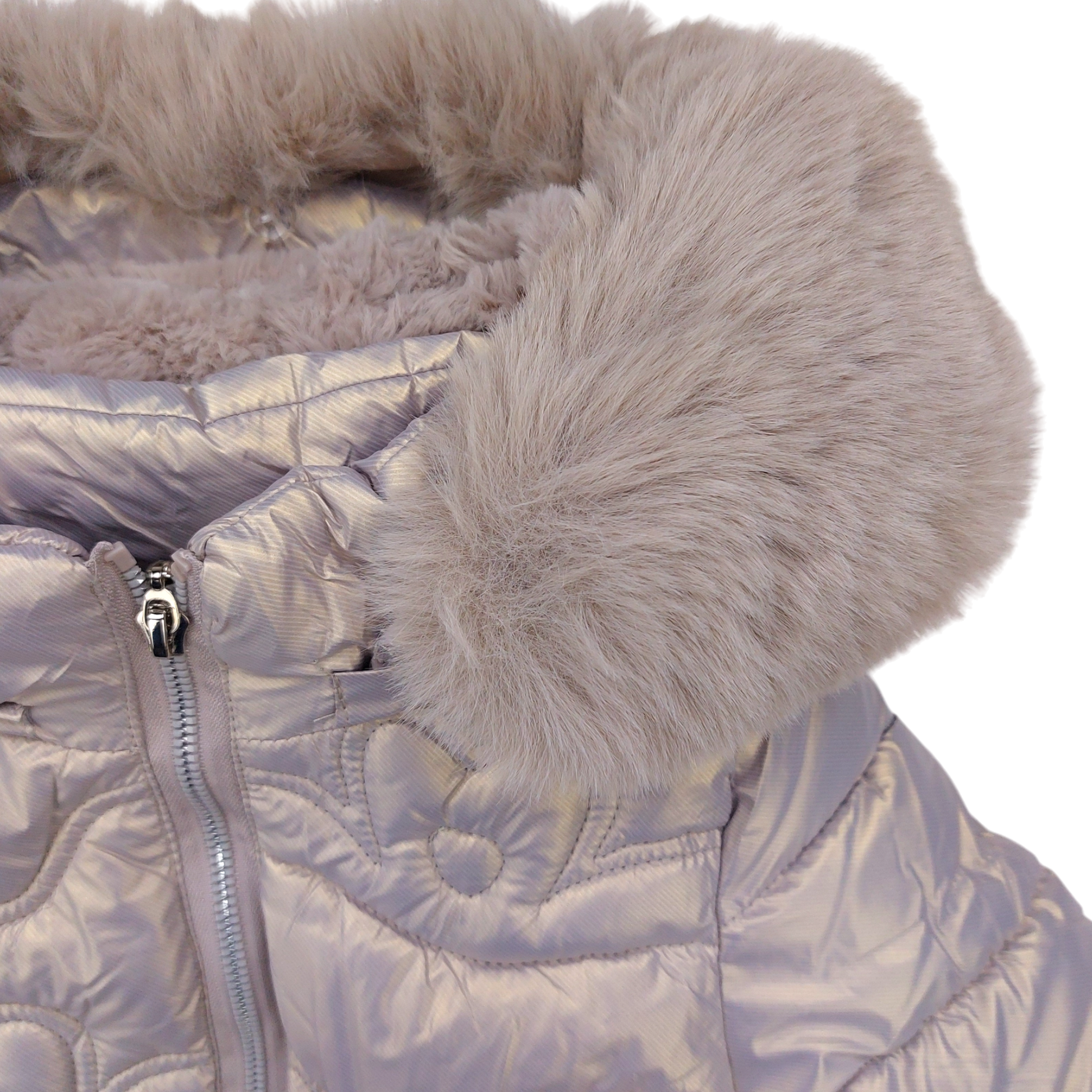 Elegante beige Winterjacke für Mädchen aus der Herbst-/Winterkollektion . Die Jacke hat eine abnehmbare Kapuze mit auffälligem Teddyfellbesatz und lange Ärmel . Der edle Glanz des Stoffes verleiht der Jacke einen modernen Look, während die sorgfältig verarbeiteten Blumenstickereien den femininen Charakter betonen. Reißverschlusstaschen ermöglichen die praktische und sichere Aufbewahrung kleiner Gegenstände. Das Teddyfellfutter im Inneren der Jacke sorgt auch an den kältesten Tagen für wohlige Wärme.