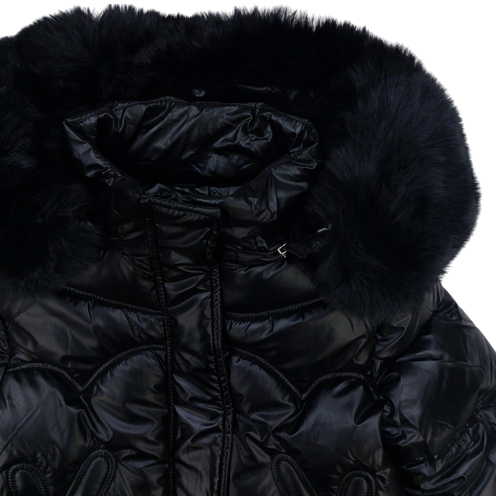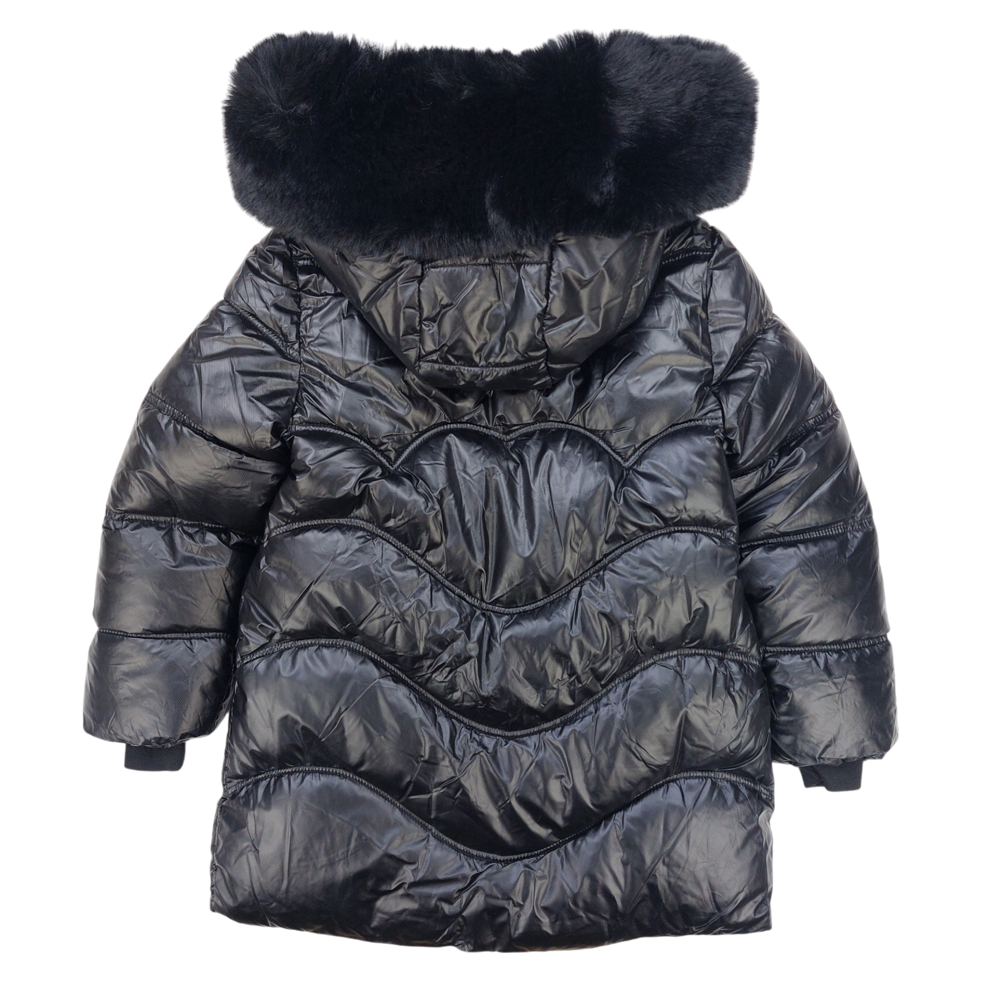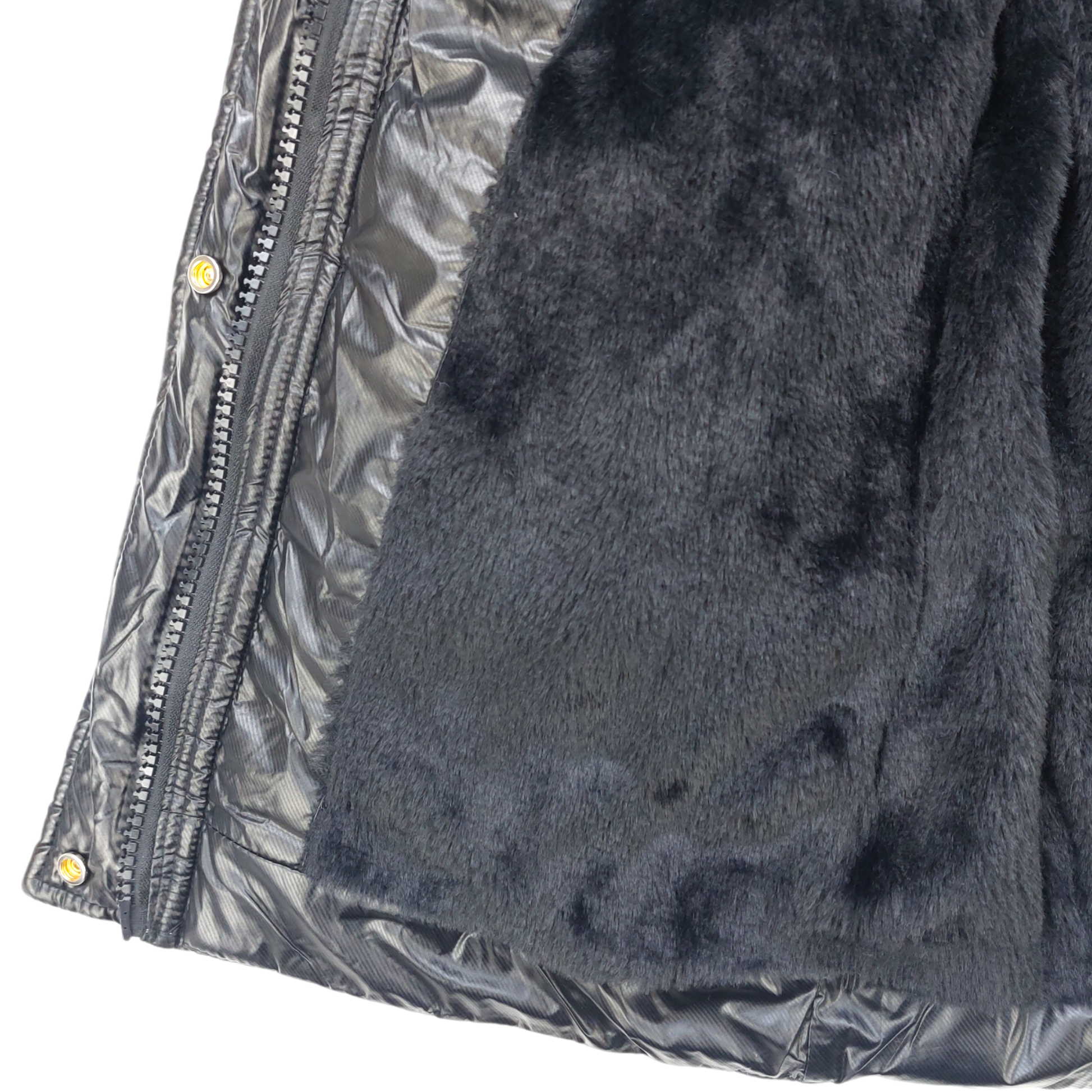 Eine modische schwarze Winterjacke für Mädchen , perfekt für die Herbst- und Wintersaison . Die Jacke verfügt über eine abnehmbare Kapuze mit auffälligem Kunstfellbesatz, die für einen stylischen Look und Schutz vor Kälte sorgt. Lange Ärmel und Reißverschlusstaschen sind praktische Details, die den Tragekomfort erhöhen. Ein Reißverschluss mit Druckknopfleiste schützt vor Wind, und das Teddyfutter im Inneren der Jacke sorgt für Wärme an kalten Tagen.