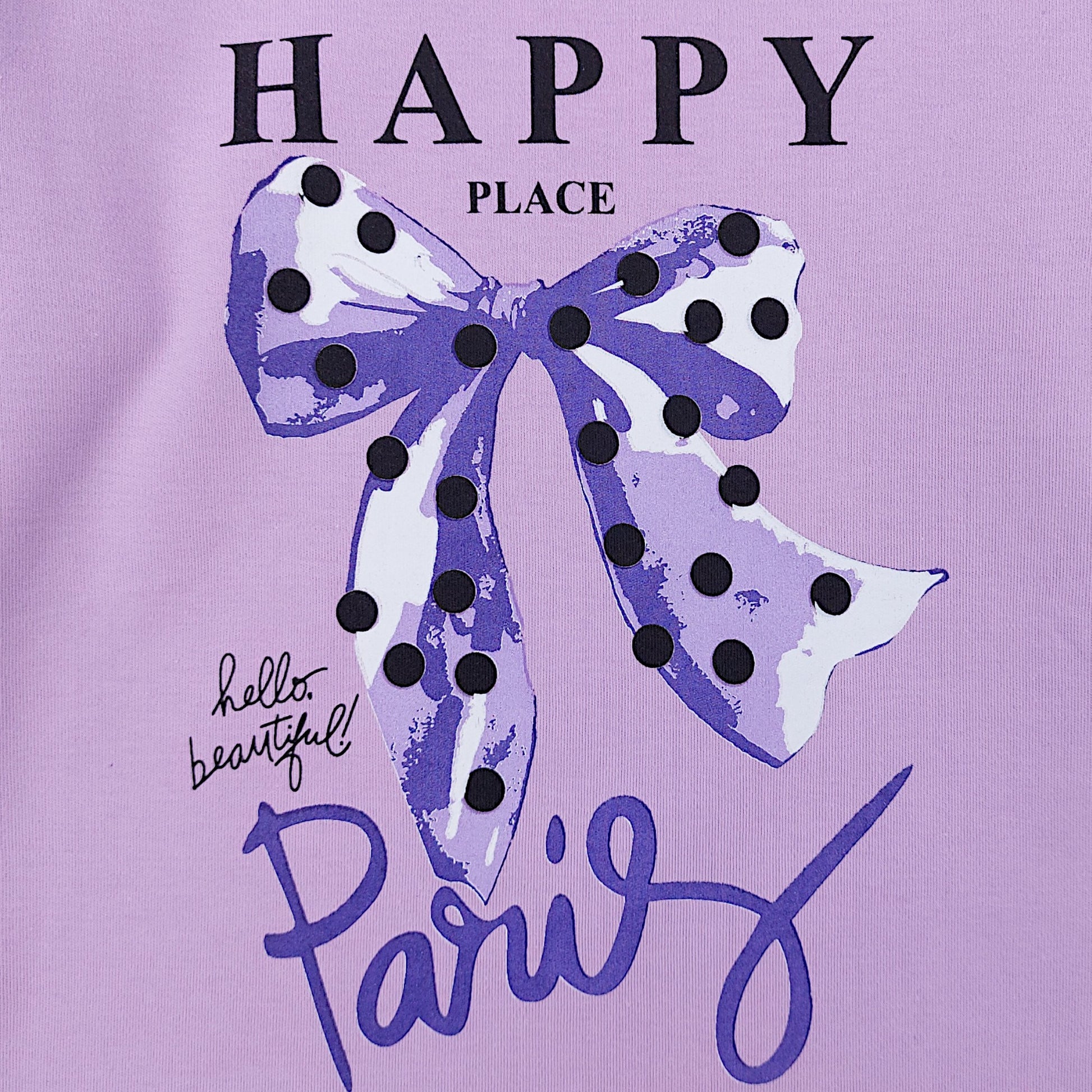 Lilafarbener Mädchenpyjama mit langen Ärmeln und langer Hose. Das Oberteil ist mit einem bezaubernden Schleifenmuster und der Aufschrift „Happy Place – Hello Beautiful Paris“ verziert. Die Hose ist vollständig mit einem zarten Schleifenmuster bedeckt. Der Pyjama hat weder Taschen noch Verschlüsse und bietet so maximalen Tragekomfort.