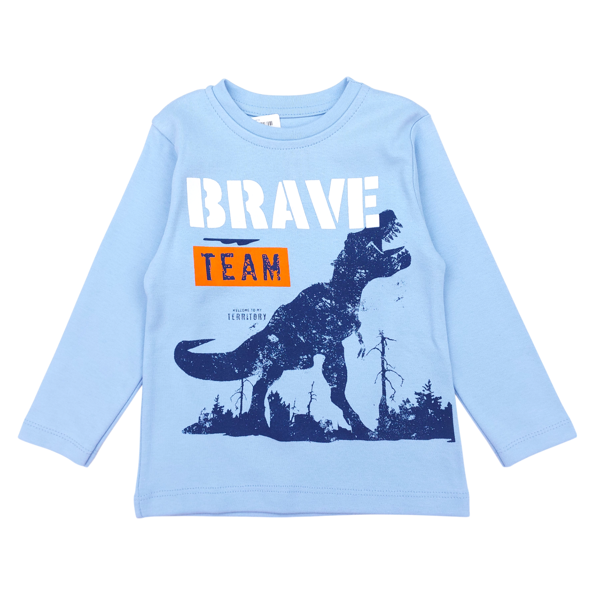 Dinosaurier -Schlafanzug für Jungen, komplett aus weicher und bequemer Baumwolle . Das langärmlige Oberteil zeigt eine T-Rex-Silhouette und den Schriftzug „Brave Team“. Die Hose hat einen bequemen elastischen Bund und ist mit Dinosaurier-Grafiken verziert, die das Set perfekt ergänzen. Der Verzicht auf Taschen und Verschlüsse sorgt für maximalen Schlafkomfort. Dank der langen Ärmel und Beine perfekt für Herbst und Winter.