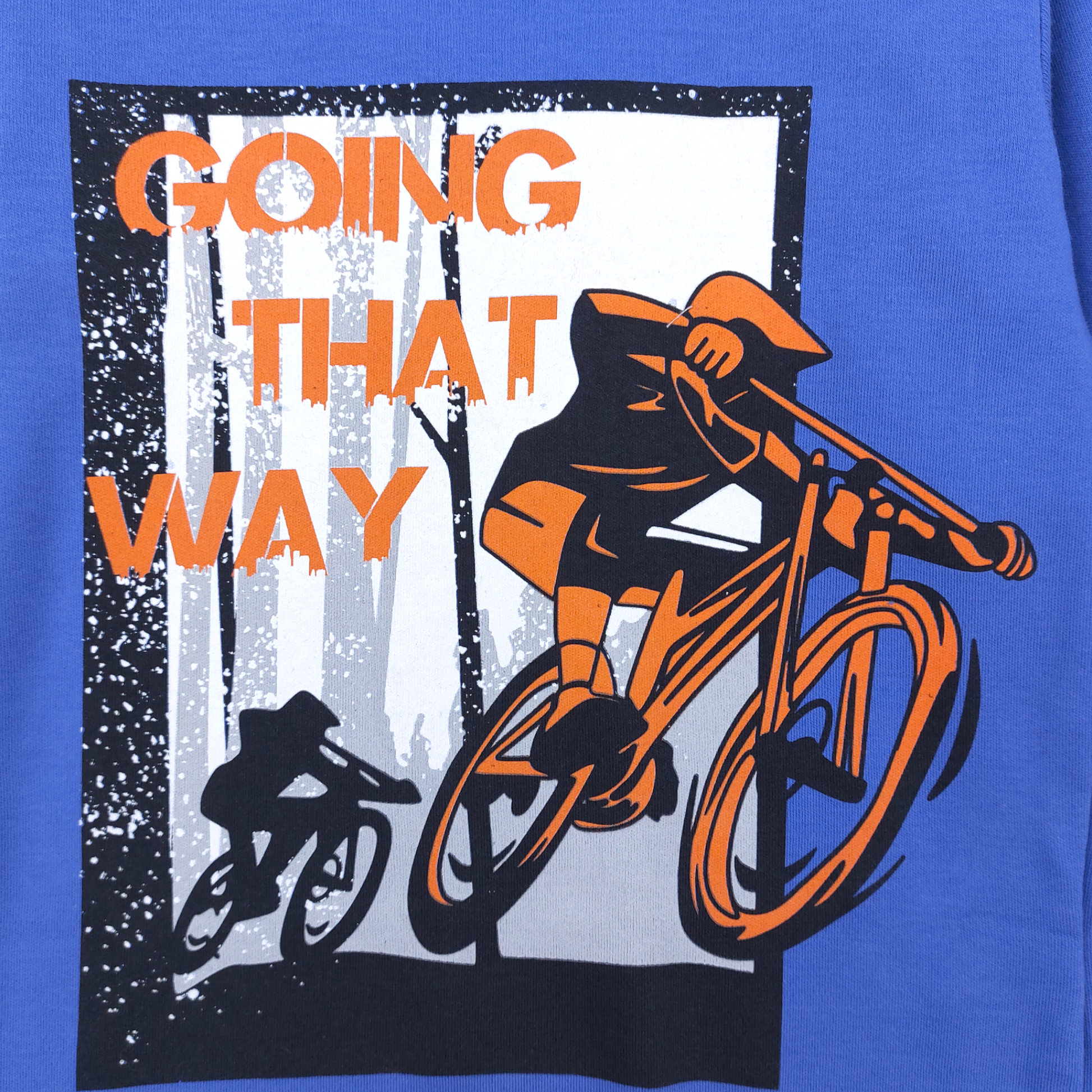 Jungen-Schlafanzug mit Radsportmotiv aus weicher, atmungsaktiver Baumwolle . Das langärmlige Oberteil zeigt eine dynamische Radsportszene und den Schriftzug „Going That Way“. Die Hose mit elastischem Bund und farbenfroher Radsportgrafik rundet das Set perfekt ab. Der Verzicht auf Taschen und Verschlüsse sorgt für maximalen Komfort und Sicherheit. Geeignet für Herbst und Winter.