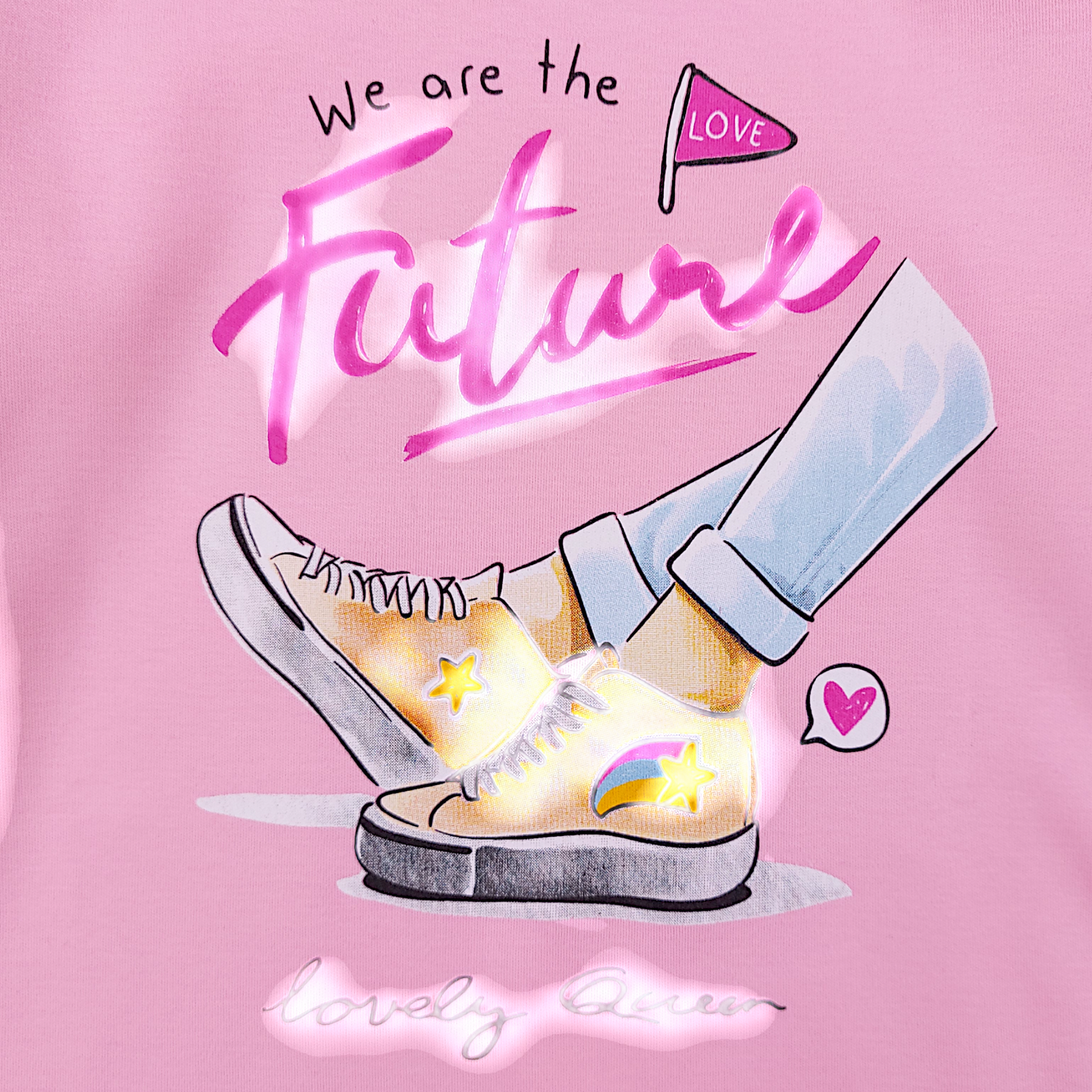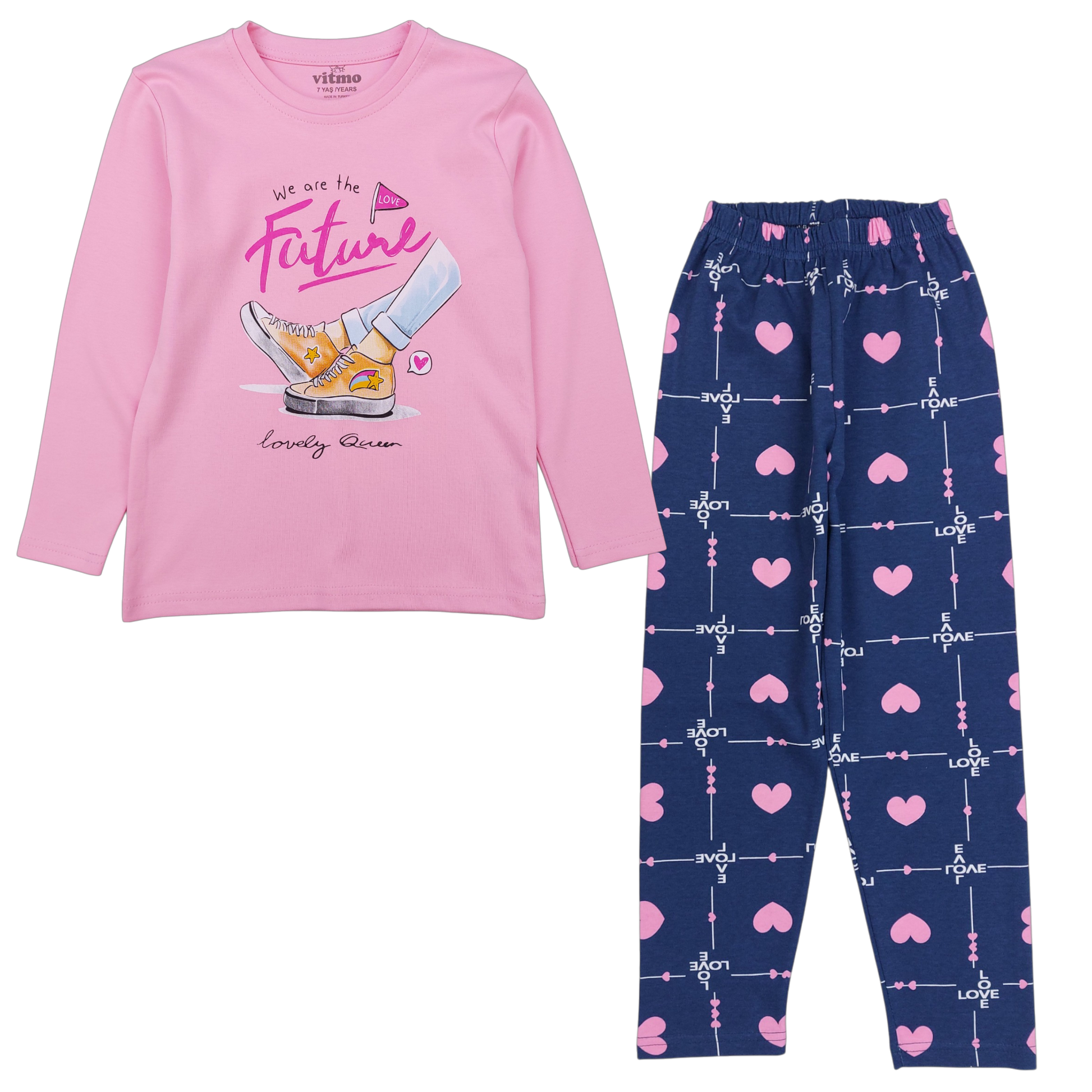 Stilvoller rosafarbener Mädchenpyjama mit langen Ärmeln und langer Hose. Das Oberteil ist mit dem „We are the Future“-Print, Sneakers und dezenten grafischen Details versehen. Die marineblaue Hose ist mit rosa Herzen und dem Schriftzug „LOVE“ verziert. Der bequeme Schnitt ohne Taschen und Verschlüsse sorgt für Bewegungsfreiheit und Tragekomfort.