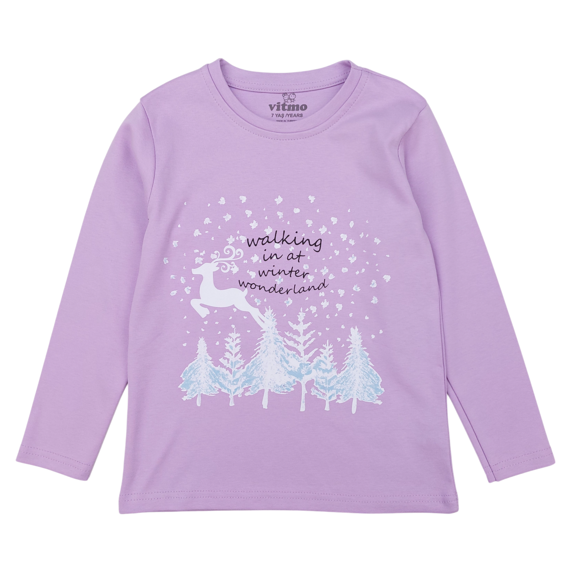 Lila Weihnachts-Rentier-Pyjama Vitmo ist die perfekte Wahl für die Herbst-Winter-Saison, insbesondere während der Feiertage. Hergestellt aus weichem und atmungsaktivem Stoff. Baumwolle , bietet maximalen Komfort und Wärme an kühlen Abenden. Das langärmlige Pyjamaoberteil zeigt einen bezaubernden Print, der ein Rentier in einer Winterlandschaft, umgeben von Schneeflocken und Bäumen, mit dem Slogan „Walking in a Winter Wonderland“ zeigt. Das Motiv ruft die zauberhafte, festliche Atmosphäre hervor, die Kinder lieben.