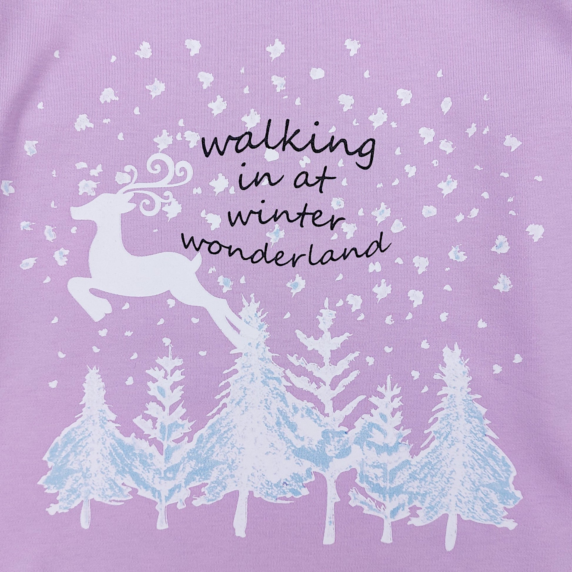 Lila Weihnachtspyjama für Mädchen mit langen Ärmeln und gerader, langer Hose. Das Oberteil ist mit einem Rentier-, Schneeflocken- und Baummuster sowie dem Slogan „Walking in a Winter Wonderland“ verziert. Die Hose hat einen elastischen Bund und ein festliches Muster aus Rentieren, Schneeflocken und Weihnachtsbäumen. Der Pyjama hat keine Taschen und ist für maximalen Komfort mit einem Verschluss versehen.