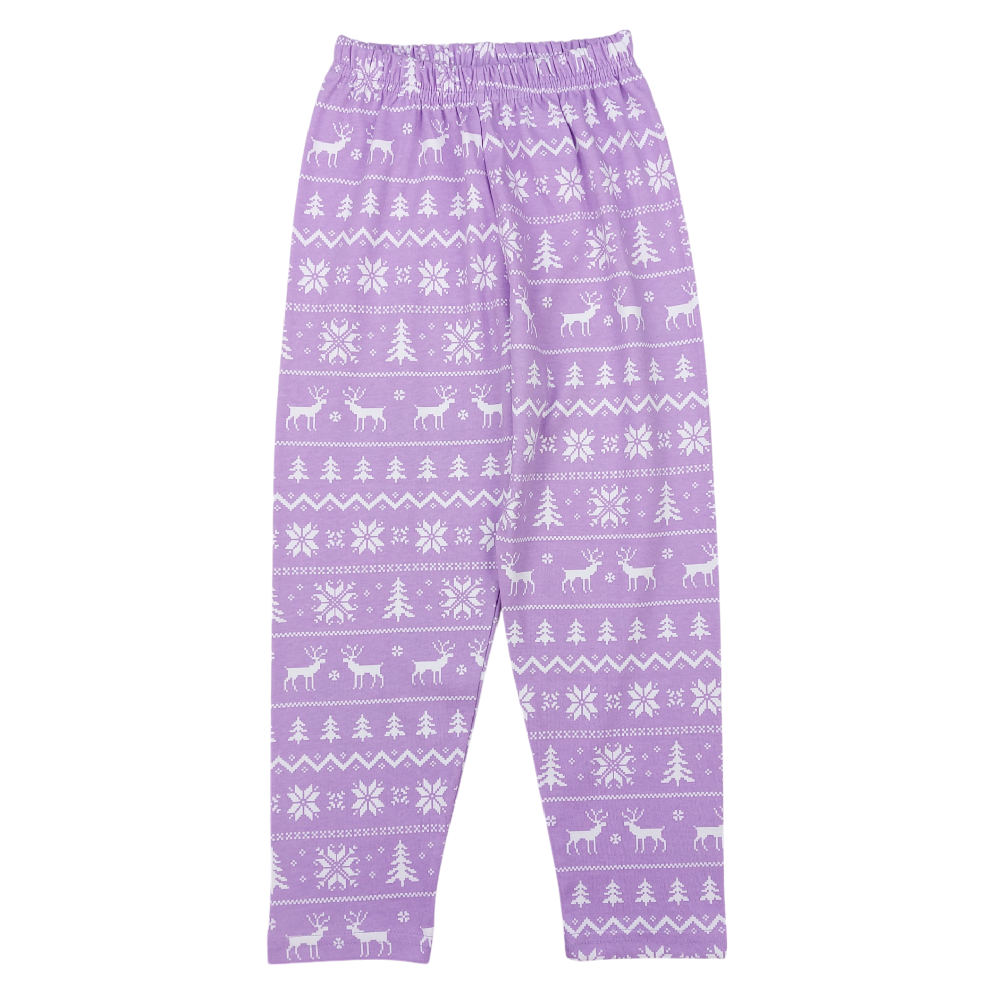 Diese dehnbare lila Hose ist mit einem üppigen Muster aus Rentieren, Weihnachtsbäumen und Schneeflocken verziert. Dank des elastischen Bunds passt sie sich perfekt der Figur Ihres Kindes an und gewährleistet volle Bewegungsfreiheit. Der Verzicht auf Taschen und Verschlüsse erhöht die Sicherheit und den Komfort und macht diesen Pyjama zur idealen Wahl für den Alltag und eine erholsame Nachtruhe.