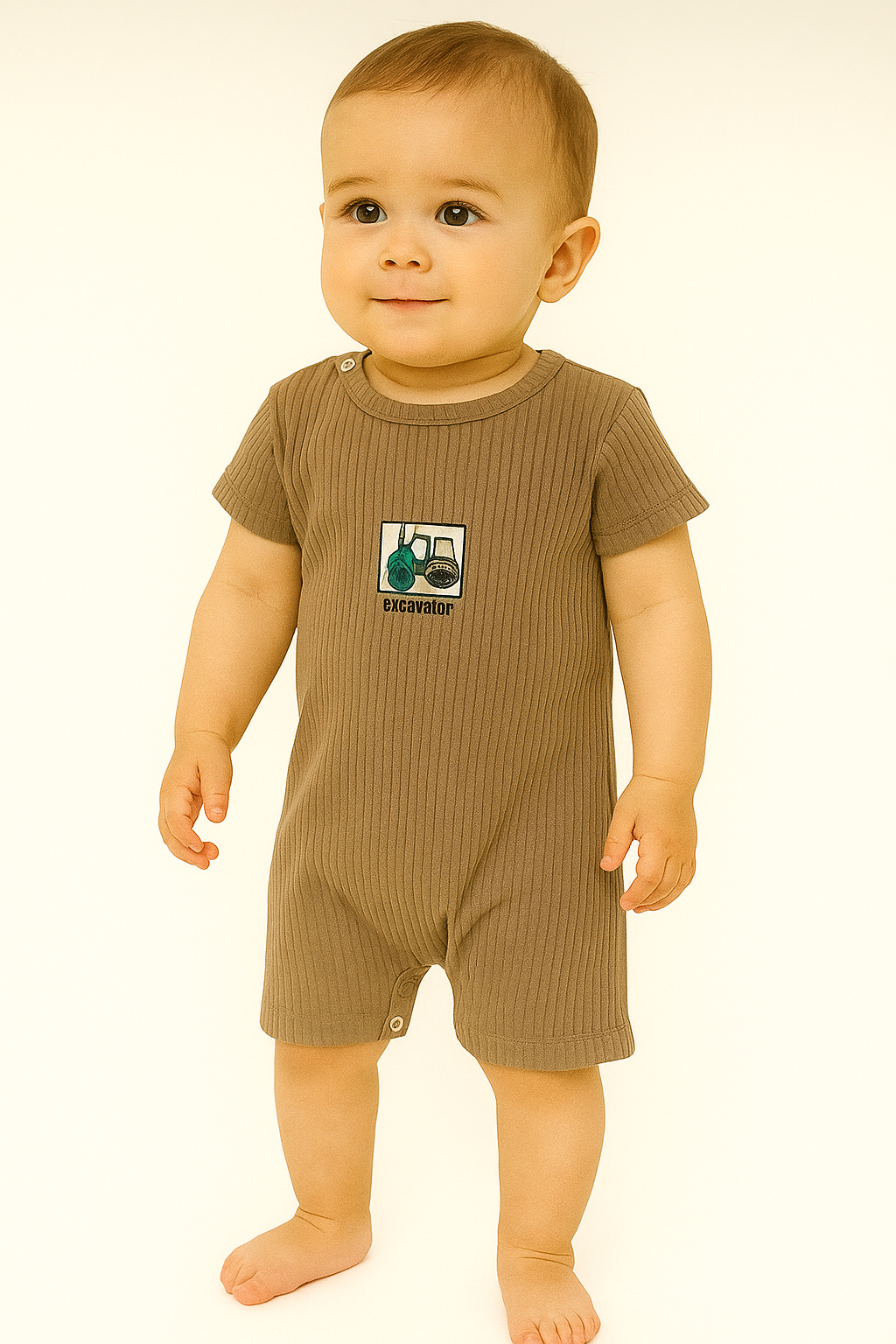 Wir präsentieren den Jungen- Strampler mit Traktormotiv der renommierten Marke Pokipo, Modell 3013-5625. Dieser charmante und funktionale Strampler wurde speziell für kleine Jungen entworfen, wobei deren Komfort und Bequemlichkeit im Vordergrund standen. Er besteht komplett aus weicher, atmungsaktiver Baumwolle und ist perfekt für warme Frühlings- und Sommertage. Der Strampler ist in einem schönen Braunton gehalten, der das Traktormotiv perfekt ergänzt und ihm eine jungenhafte Note verleiht.