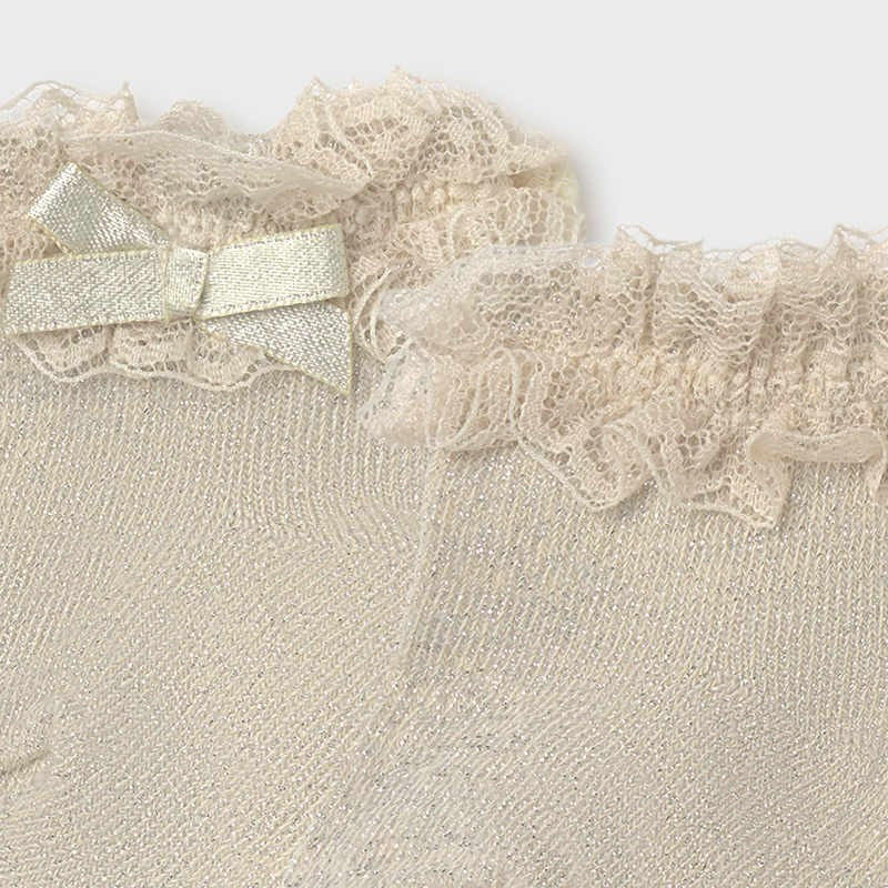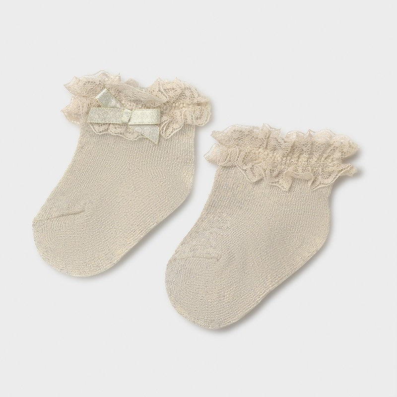 Kindersocken mit Spitzenrüschen und Goldfaden für Mädchen von Mayoral aus der Neugeborenen-Mädchenkollektion für die Saison Frühjahr/Sommer, Produktcode 9367, Farbe 84 Gold. Kleidung für Neugeborene.