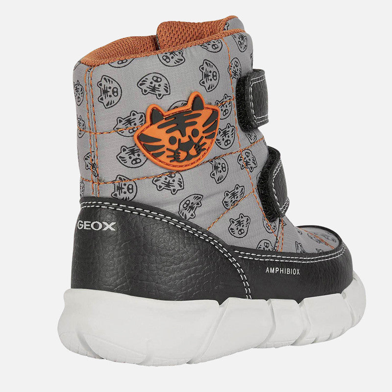 Diese einzigartigen Geox Schneestiefel mit Amphibiox-Technologie sind das perfekte Schuhwerk für aktive Jungen, die Winterabenteuer lieben. Ihr einzigartiges Design mit grauen und schwarzen Akzenten und einem Tigermotiv verleiht ihnen einen unverwechselbaren Charakter. Jedes Element dieser Stiefel ist auf maximalen Komfort und Schutz vor winterlichen Bedingungen ausgelegt.