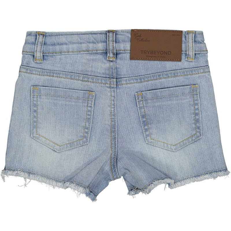 TRYBEYOND Kinder-Jeansshorts mit Strasssteinen für Mädchen aus der Frühjahr-Sommer-Kollektion, Produktcode 21994, Farbe 60A Blau. Kinderbekleidung.