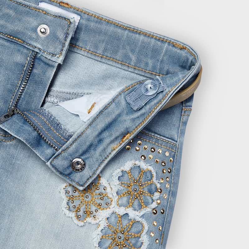 Kinder Jeansrock mit Gürtel, Strass und Stickerei für Mädchen von Mayoral aus der Mini Girl Frühjahr-Sommer Kollektion, Produktcode 3904, Farbe 37 Hellblau. Kinderbekleidung.